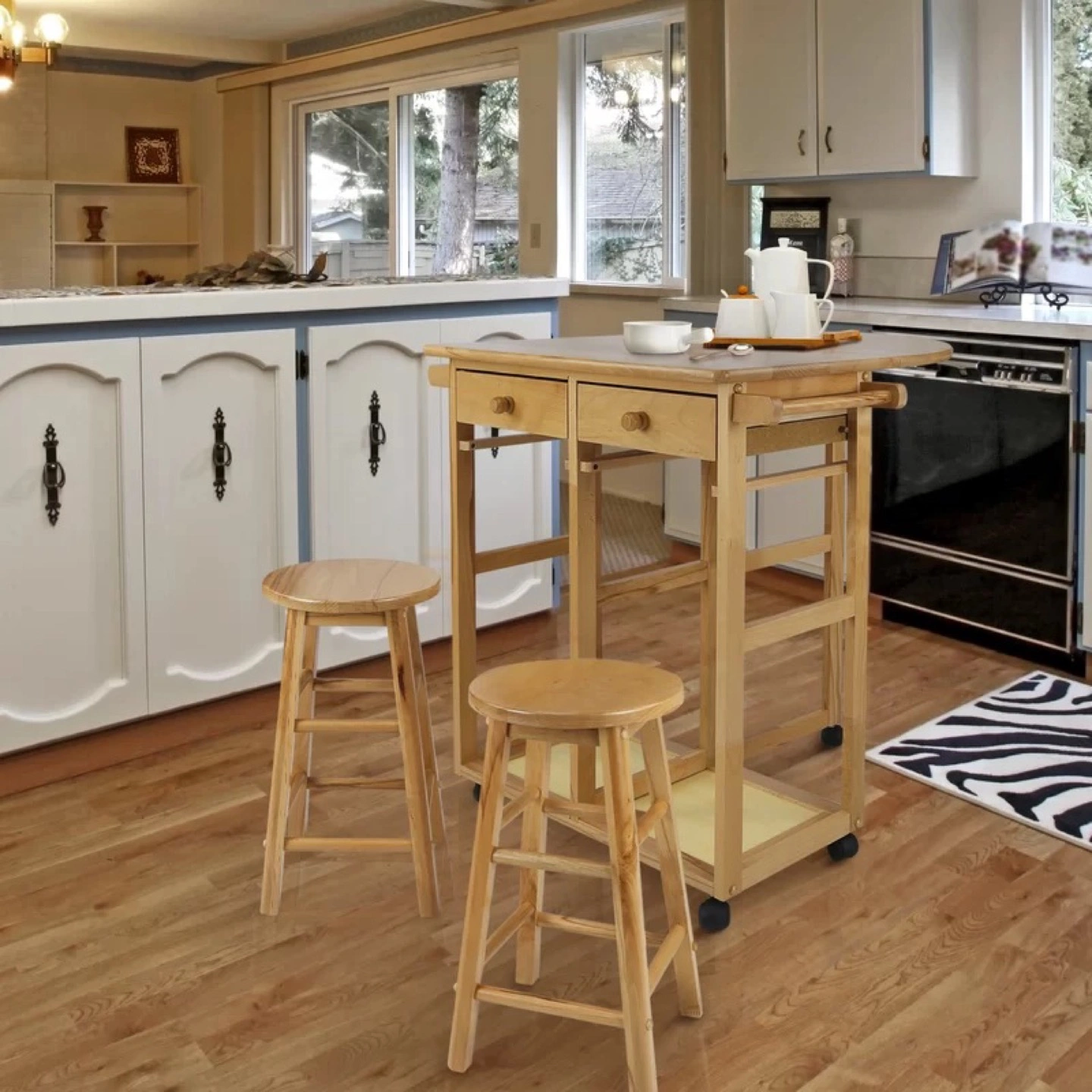 Solid wood kitchen island/breakfast bar in good condition. It is compact in design, perfect for a small space. It has two drawers, locking (and removable) wheels, a drop leaf table top, and two matching stools that can be stored underneath.