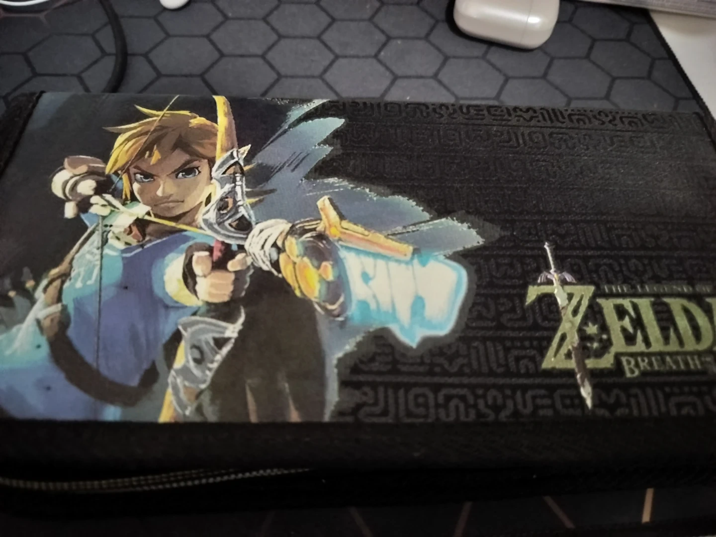 Comes with Zelda theme carrying case that can fit another 14 games, Nintendo switch dock, power adapter and USB to usb-c cable, and two joycons (red and blue)