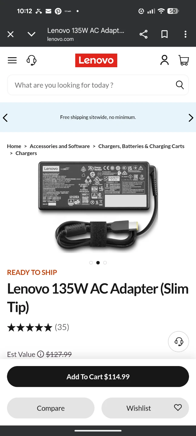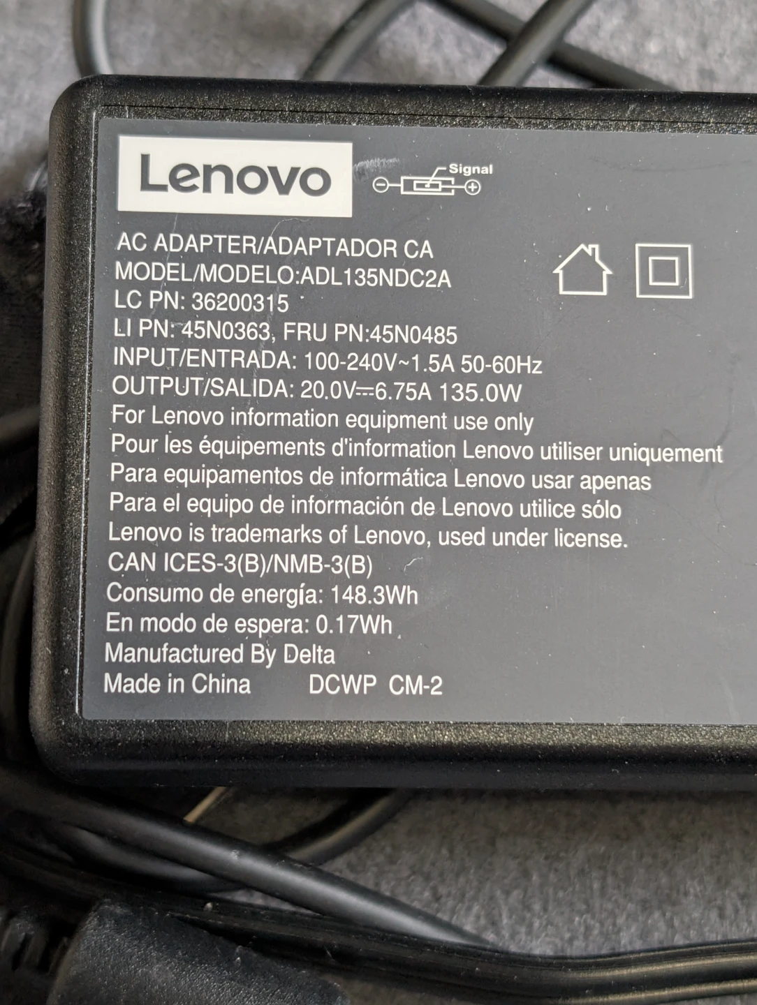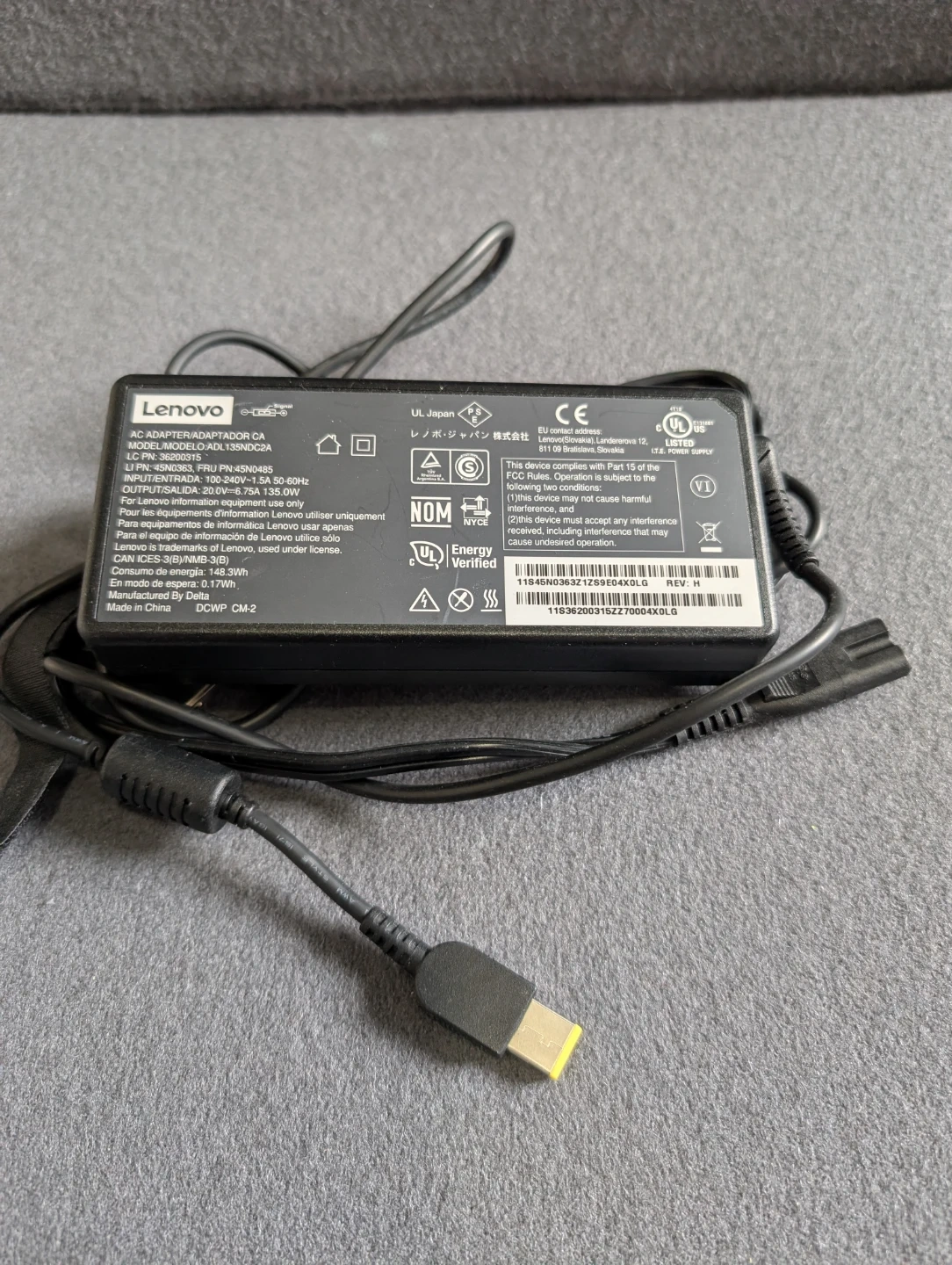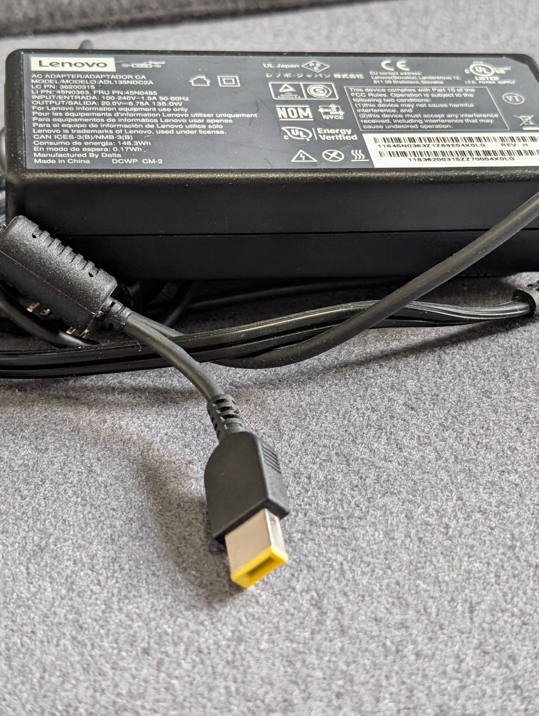 Selling a Lenovo 135W AC Adapter with a slim tip. It's black and comes with a power cord.