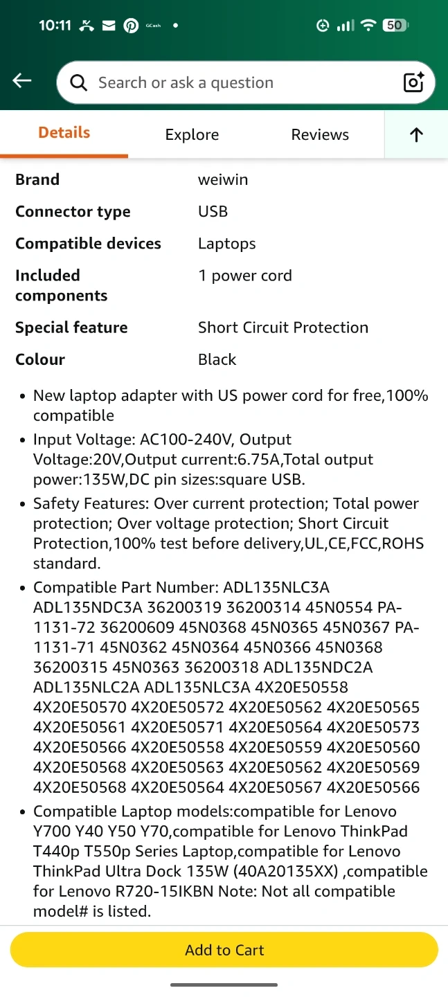 - Output Voltage: 20V, Current: 6.75A, Total output power: 135W