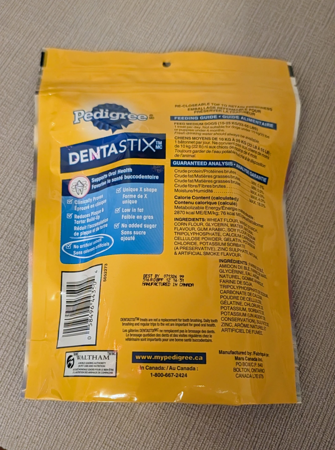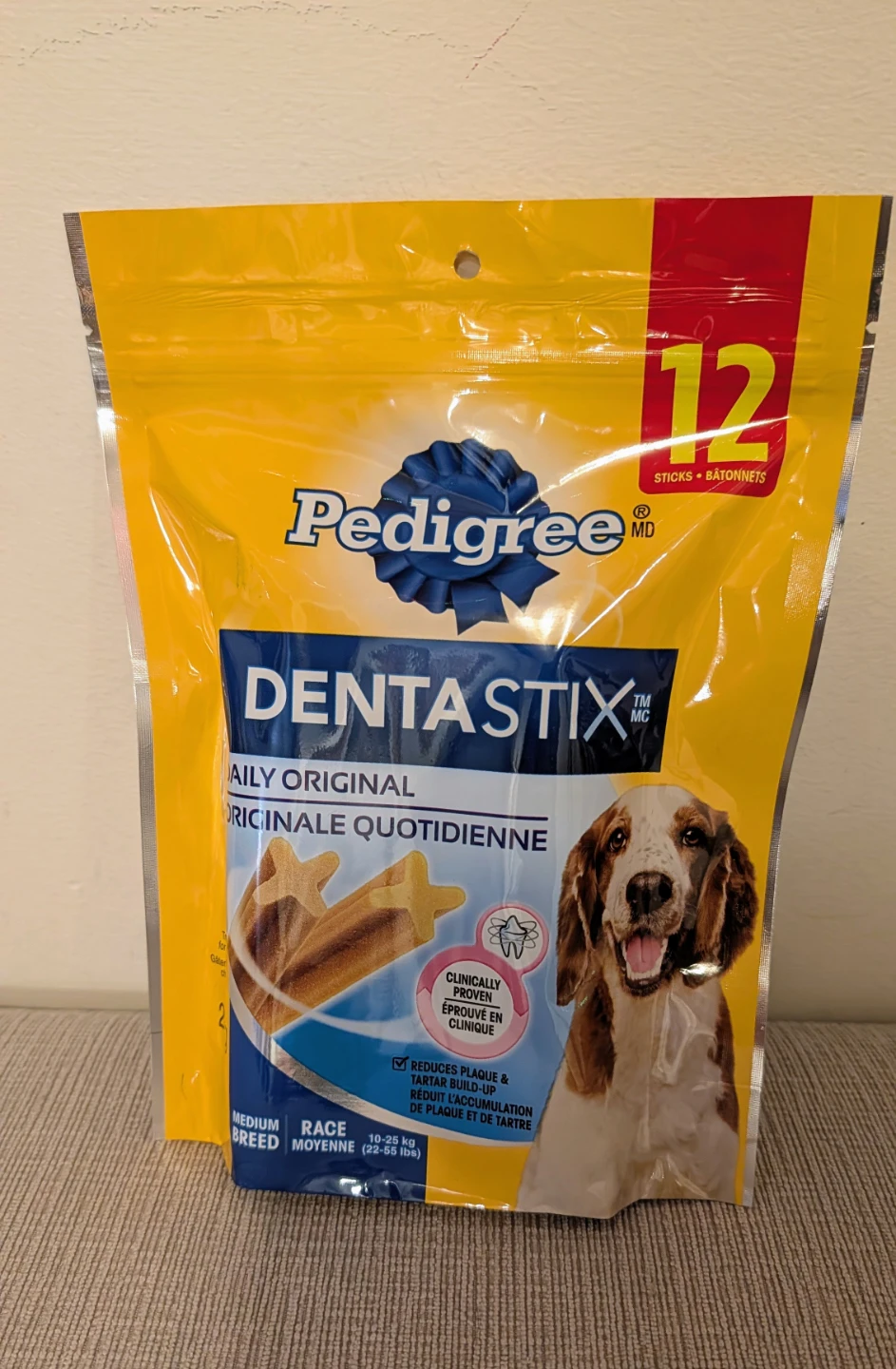 Keep your furry friend's teeth clean with Pedigree Dentastix! These daily oral care treats are designed for medium breed dogs (10-25 kg / 22-55 lbs). They help to reduce plaque and tartar build-up, promoting good oral health. The expiry date is in 2025 June 09.