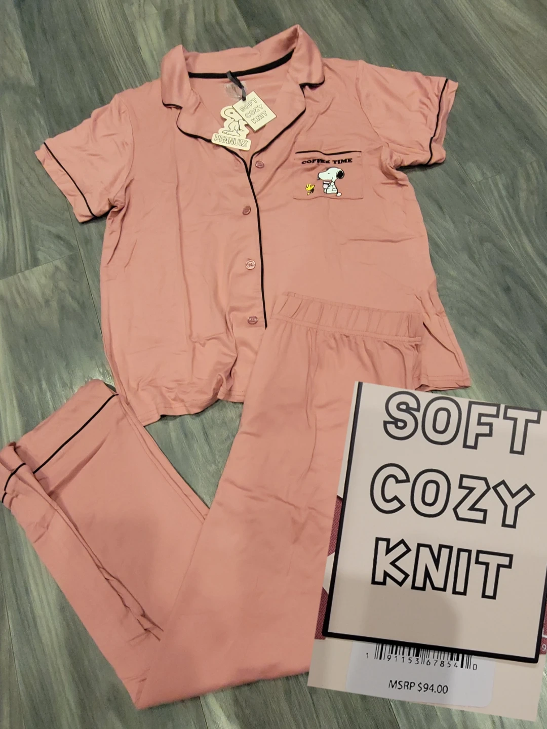 Super cute Peanuts pajama set! It's a soft and cozy knit material. The top has a 'Coffee Time' design with Snoopy. The tag says MSRP $94.00