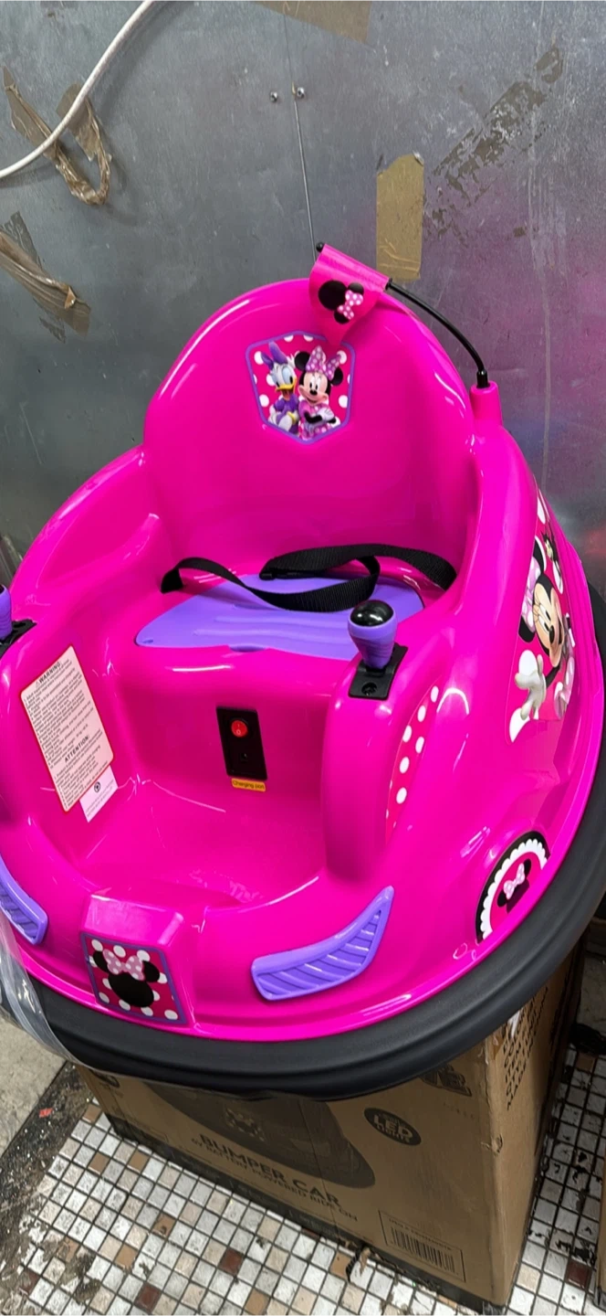 Get ready for fun with this pink Minnie Mouse bumper car! It's in great condition and comes with the original box. Perfect for your little one to ride around in style.