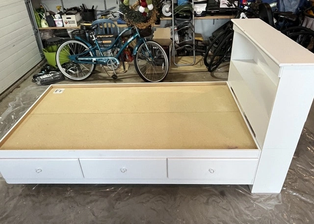This is a used, but good condition white twin bed frame with a bookcase headboard and three storage drawers, perfect for a kid's room. The bed is sturdy and in good shape, ready to use. Mattress 2 years old included.