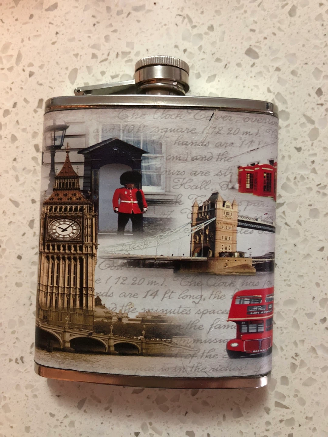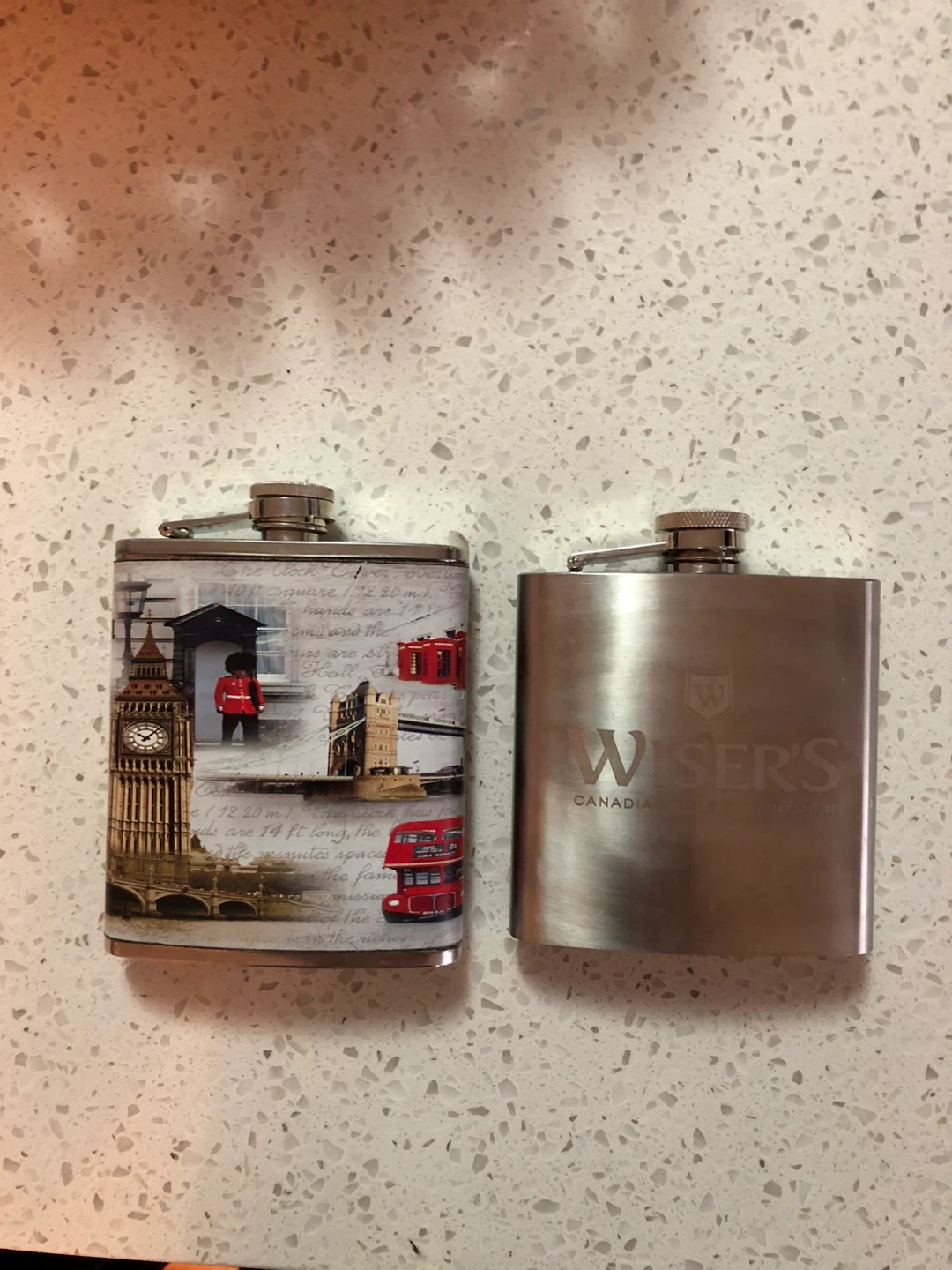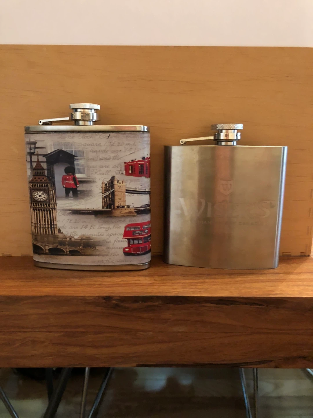 Selling a set of two flasks! One is a Wiser's Canadian Whisky branded flask, and the other features a London-themed design with Big Ben and a red double-decker bus. Great for collectors or anyone who enjoys a little something on the go