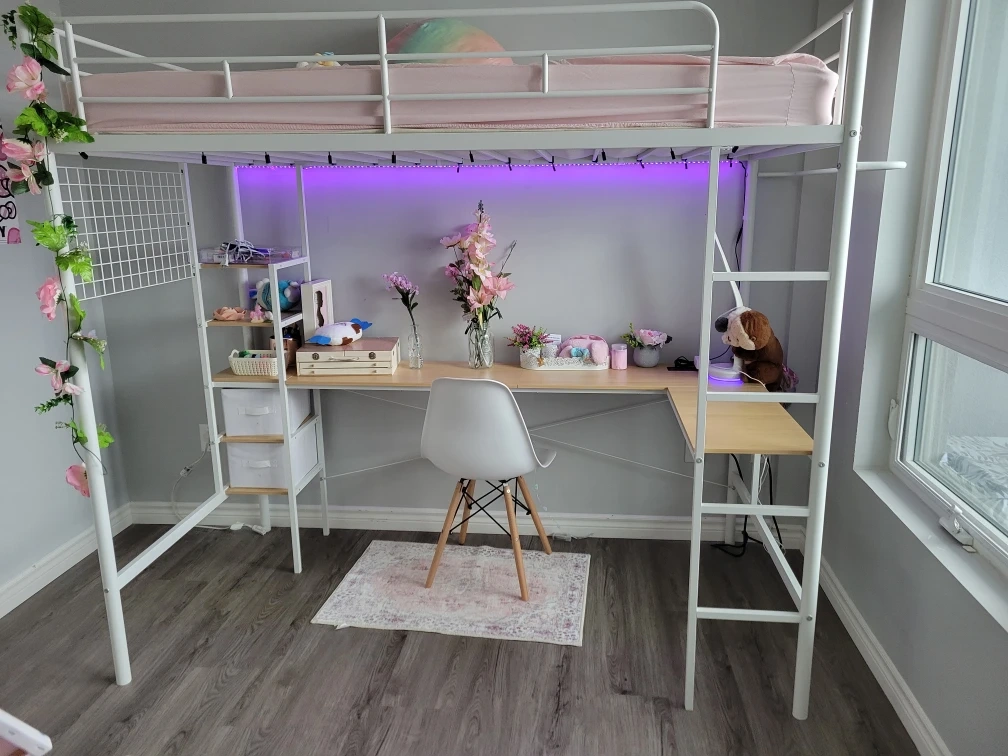 Selling a loft bed with a built-in desk! It's in great condition and perfect for saving space. The white frame gives it a clean and modern look. It's a great setup for a student or anyone needing a compact workspace