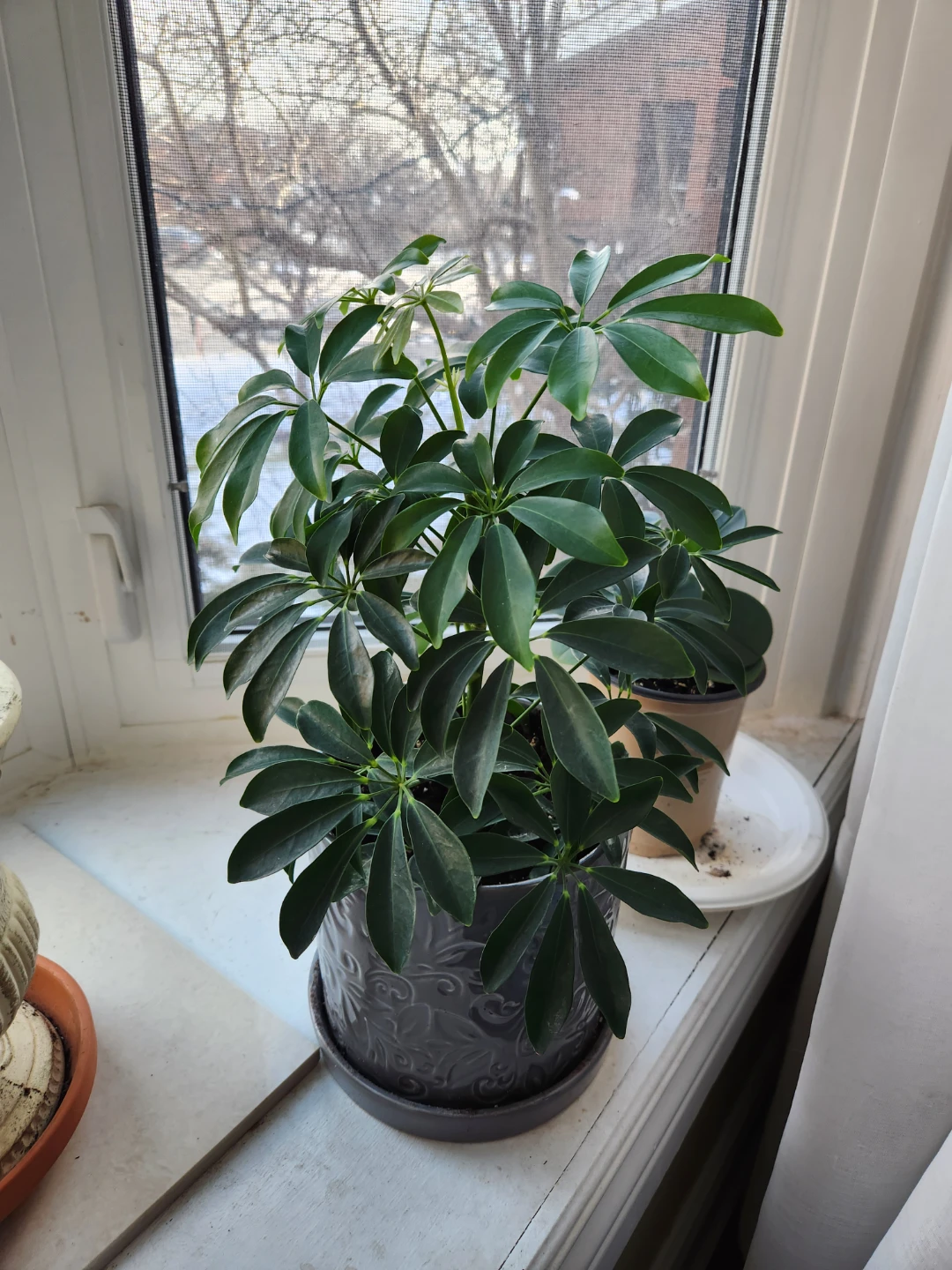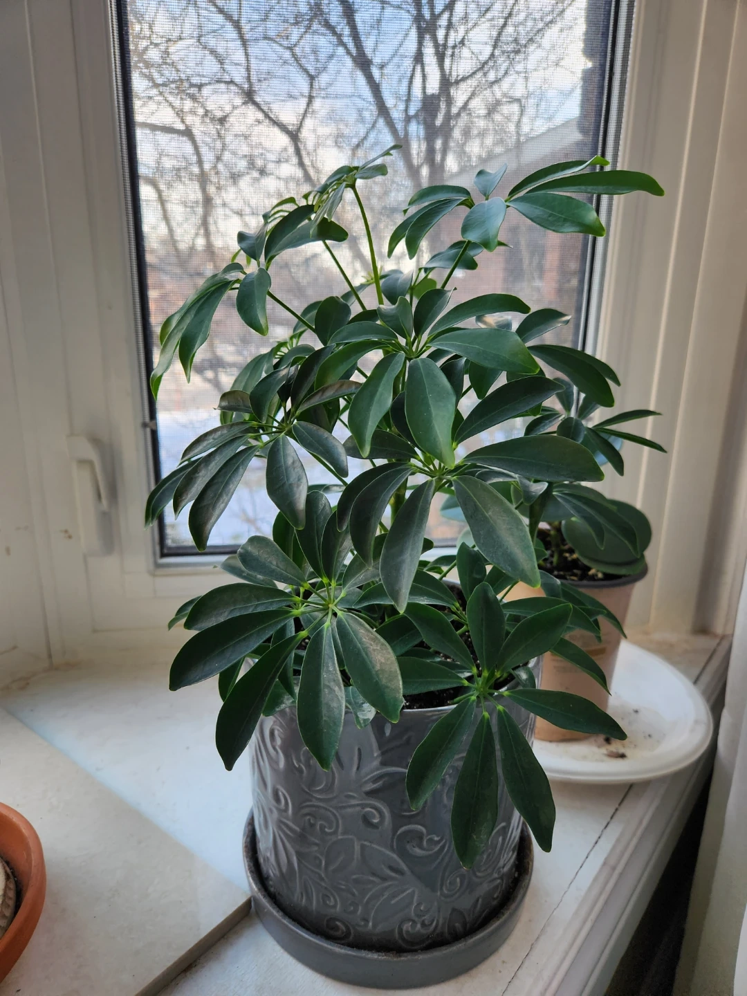 I'm selling a healthy umbrella plant potted in a lovely grey pot. It's currently sitting in a bright spot and thriving! This plant would be perfect for adding a touch of greenery to any room