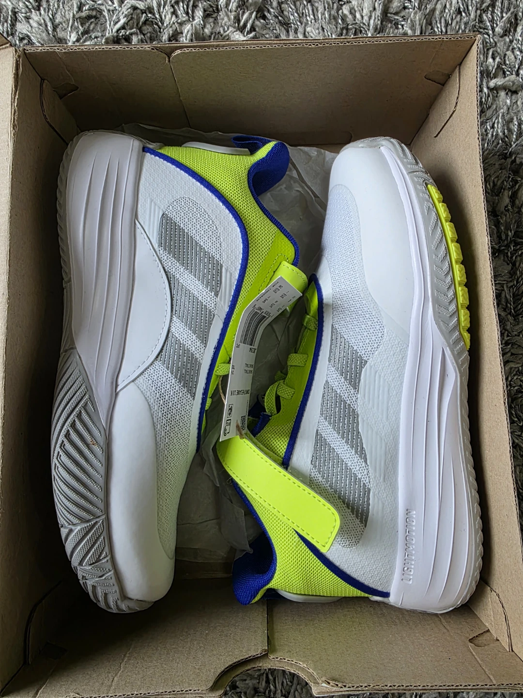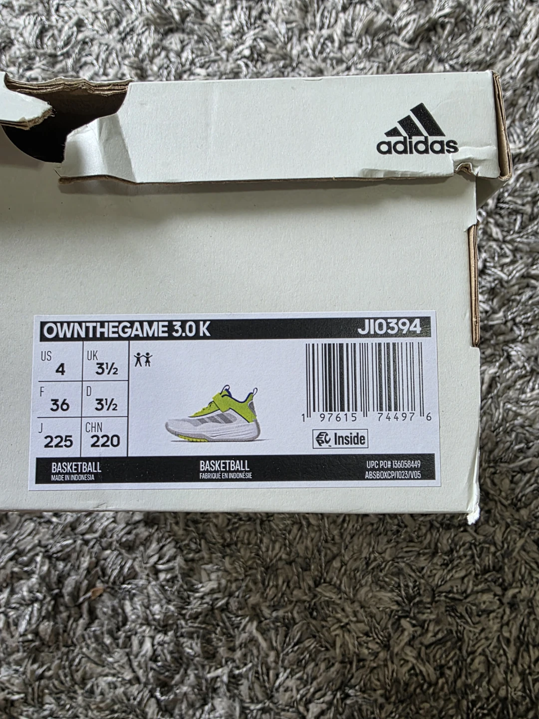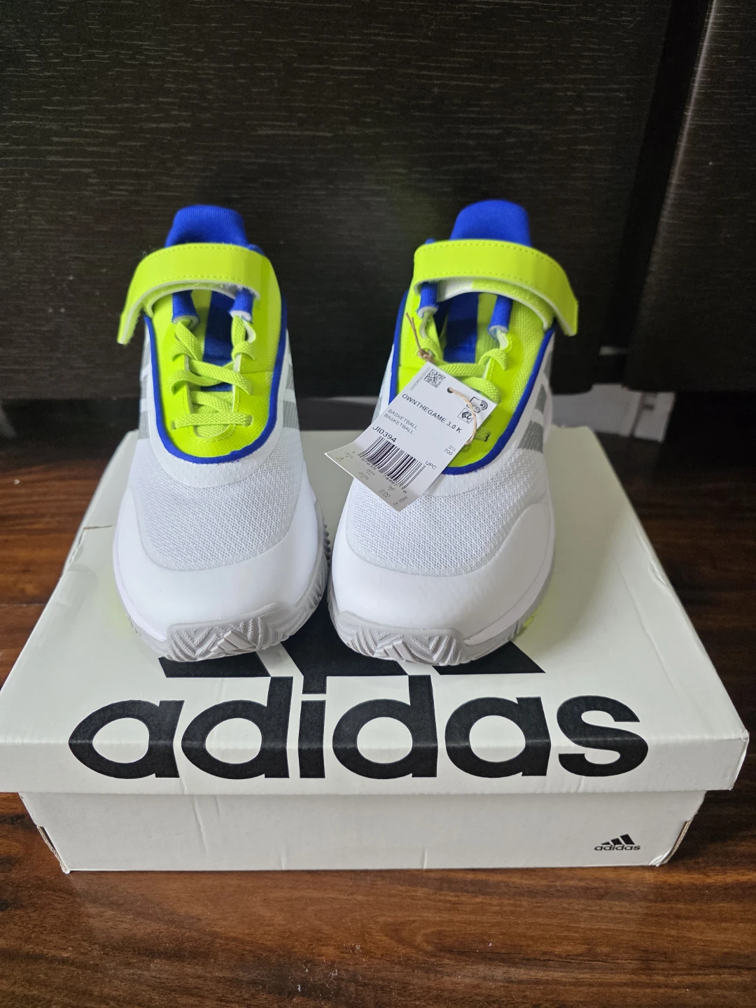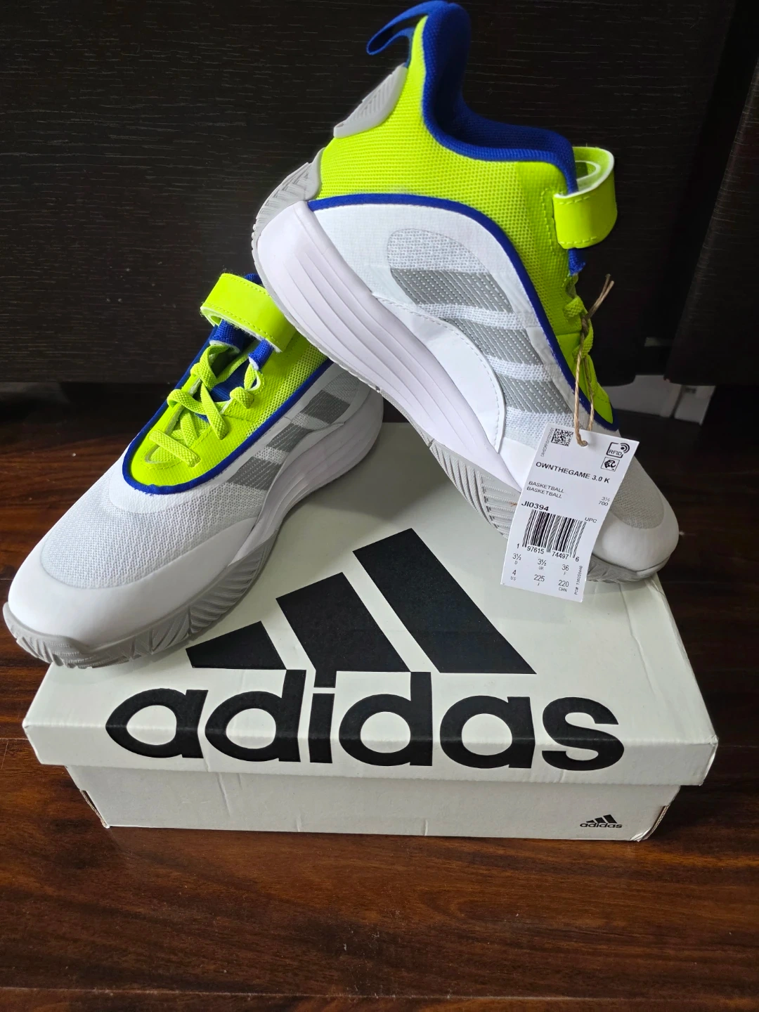 Selling a pair of Adidas Ownthegame 3.0 K youth basketball shoes in size 4 US. Brand new come with the original box. They feature a white, grey, and neon green colour scheme. Perfect for young athletes!