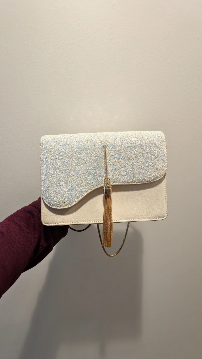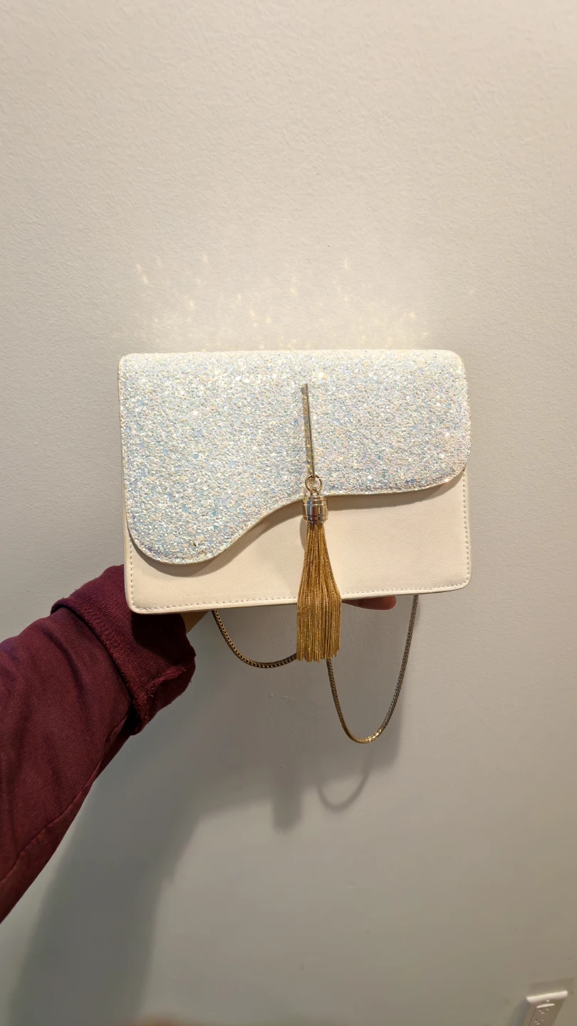 Elegant women’s clutch purse in white with a sparkly glitter flap. Finished with a gold tassel detail and a slim chain strap. Perfect for weddings, parties, formal events, or nights out. Compact, lightweight, and easy to carry.
