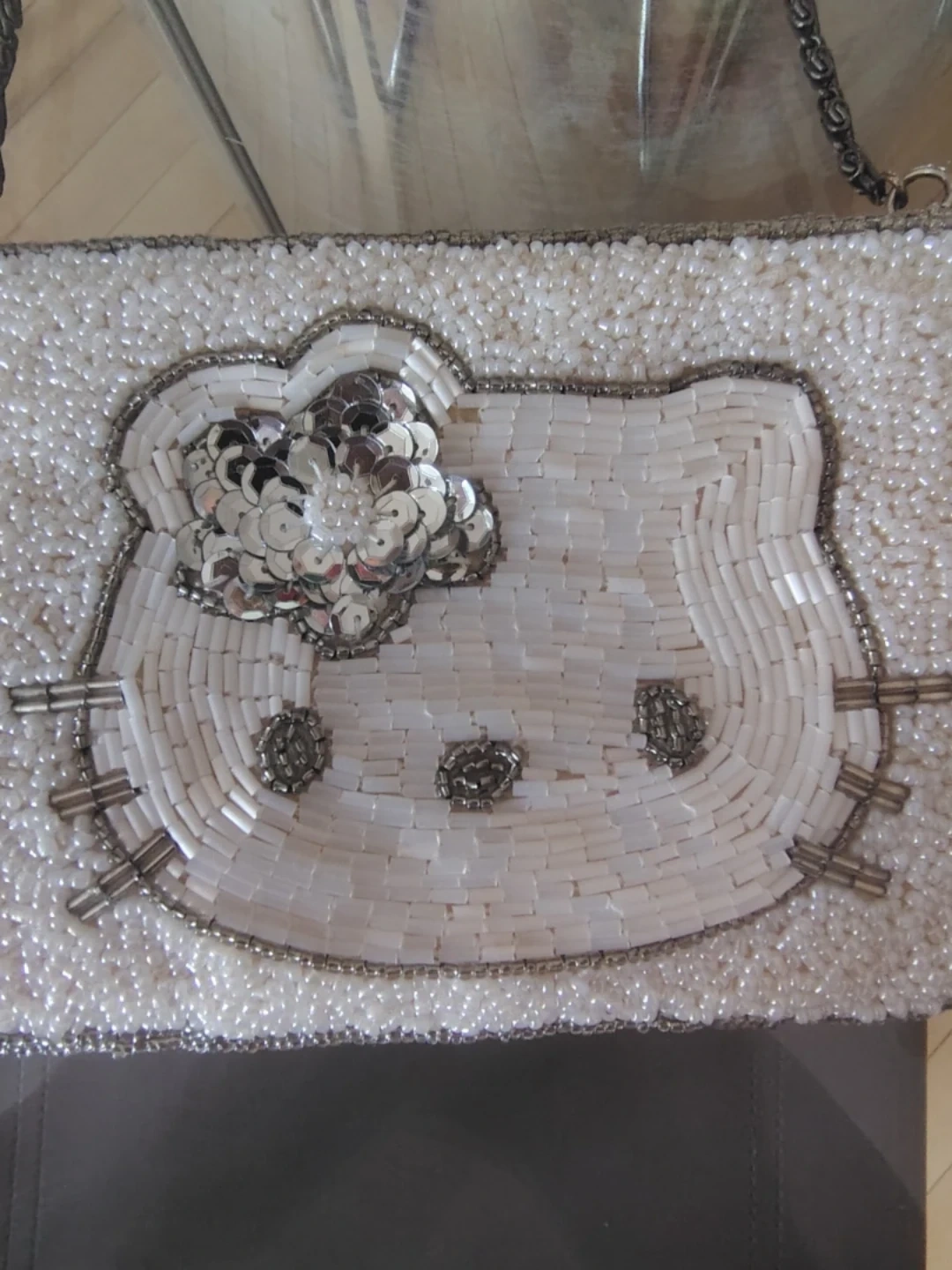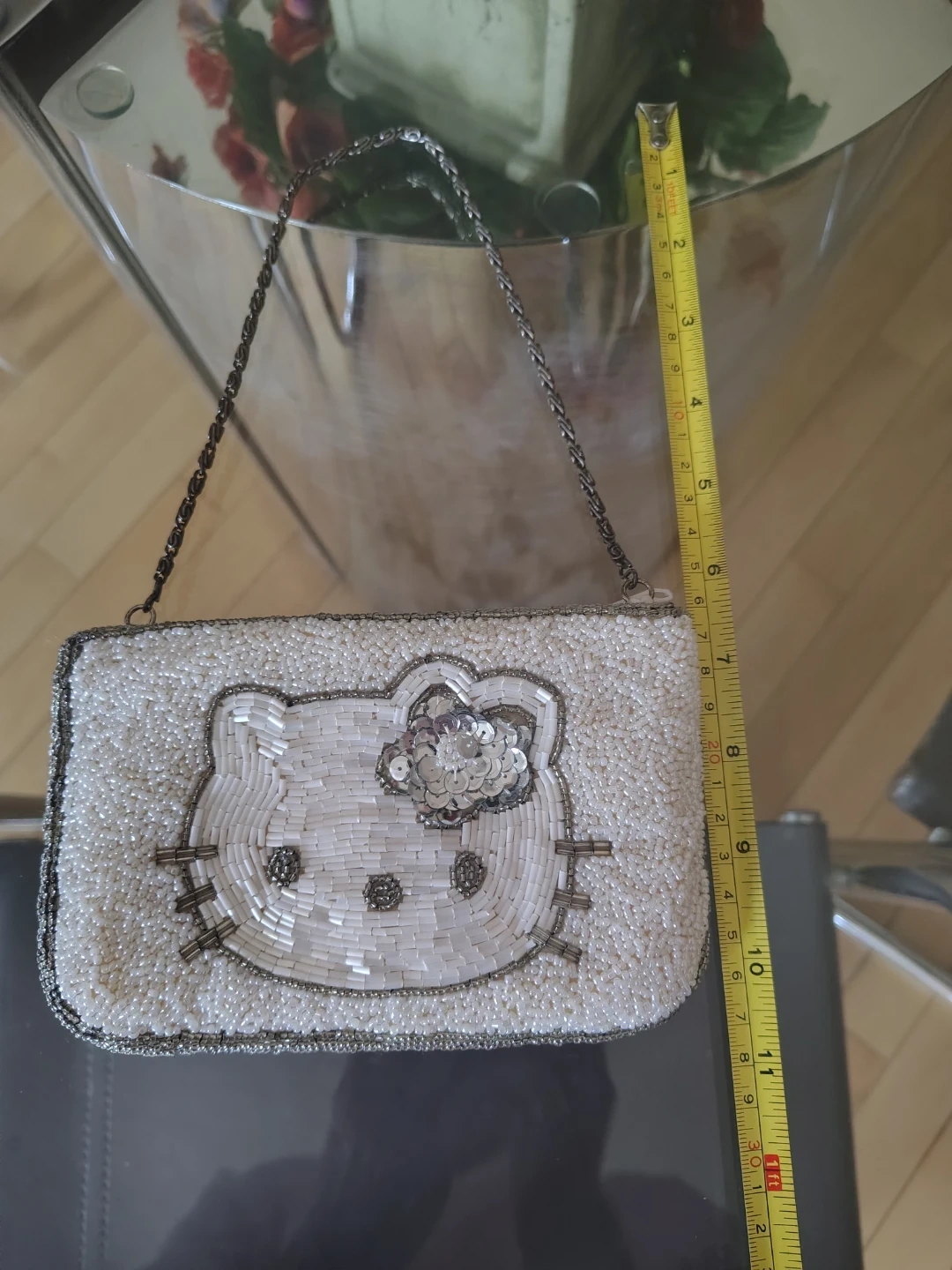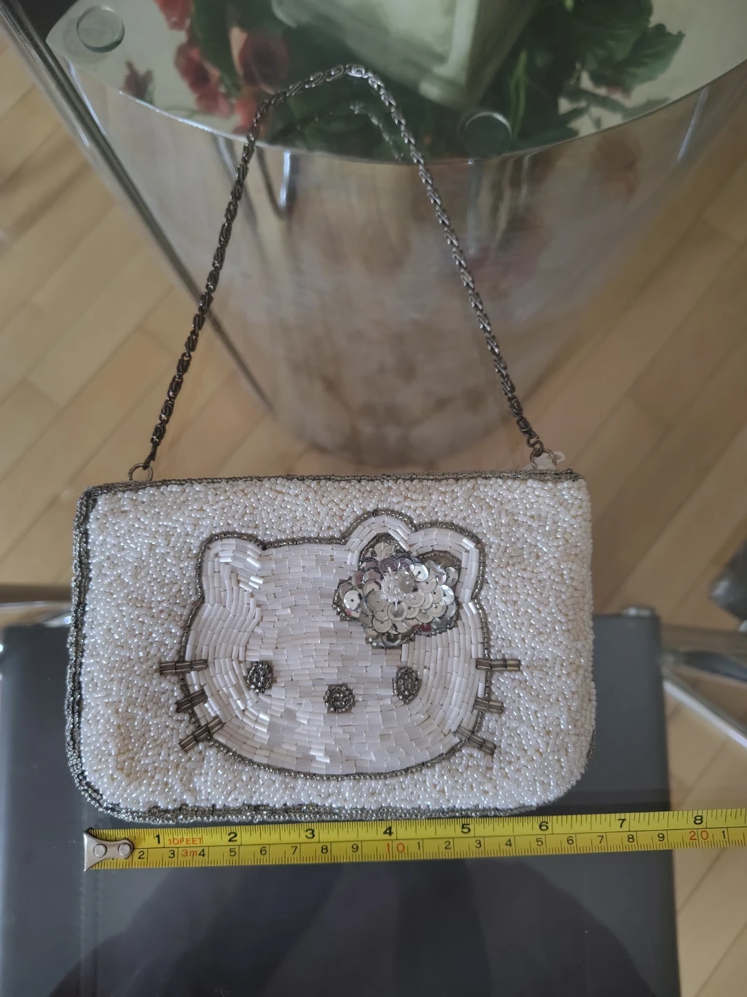 This bag was stored in its original cellophane packaging for over 2 decades and was used once only last year. All beads and sequins are fully intact β just one white bead missing as shown in the cover photo. The craftsmanship is exquisite, from the delicate pearl seed beads and bugles to the elegant chain handle. Sanrio quality at its finest.