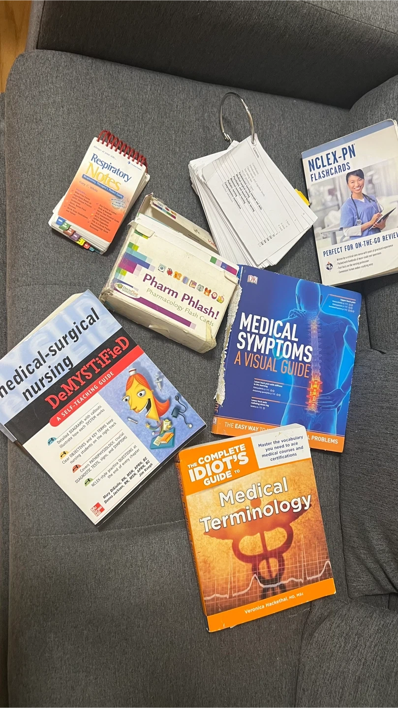 Selling a collection of medical and nursing study materials. Includes books like 'Medical-Surgical Nursing DeMYSTiFieD,' 'Medical Symptoms A Visual Guide,' and 'The Complete Idiot's Guide to Medical Terminology'. Also includes flashcards for NCLEX-PN and pharmacology.