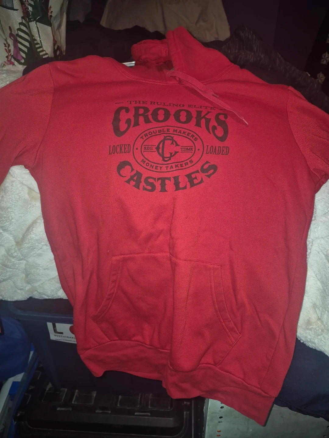 Selling a red Crooks & Castles hoodie in size small. It has a cool design on the front. The hoodie is in great shape and ready for a new owner! Can be unisex