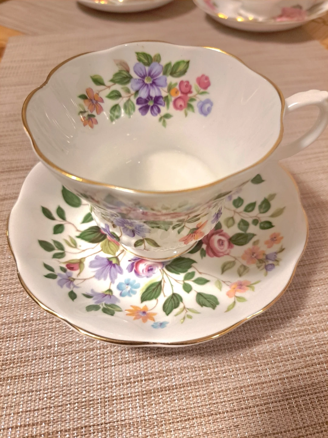Here's a beautiful Royal Albert teacup and saucer set made of bone china in England! It features a lovely floral design with a gold trim. Perfect for tea time or as a decorative piece!