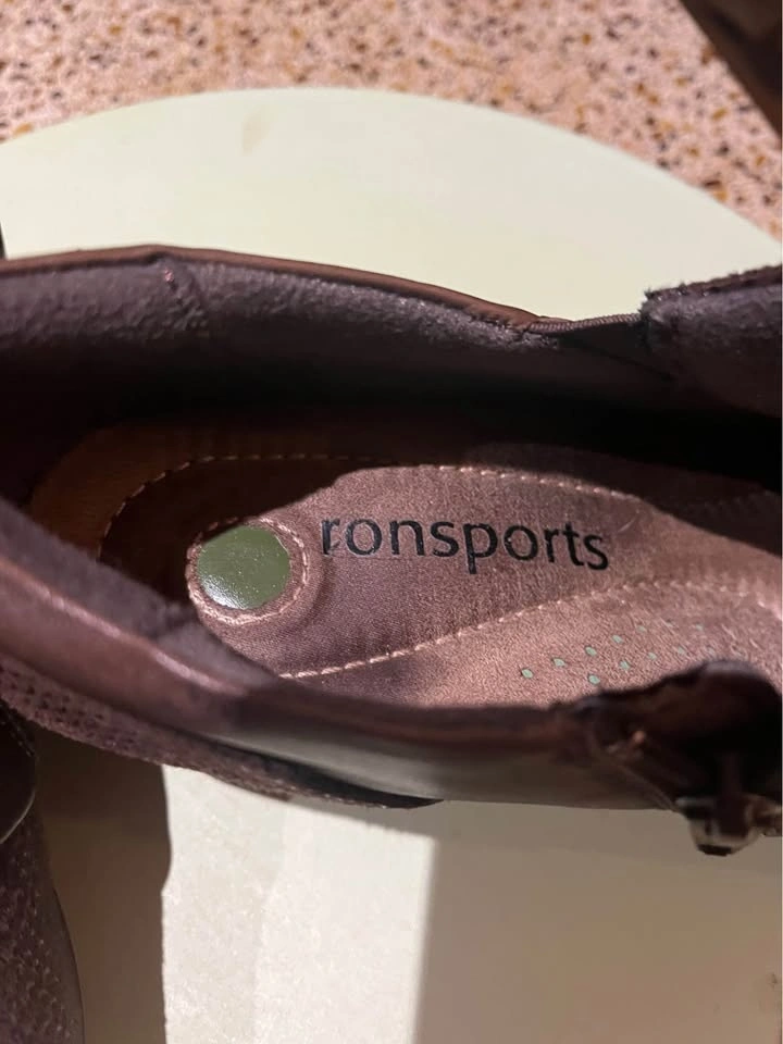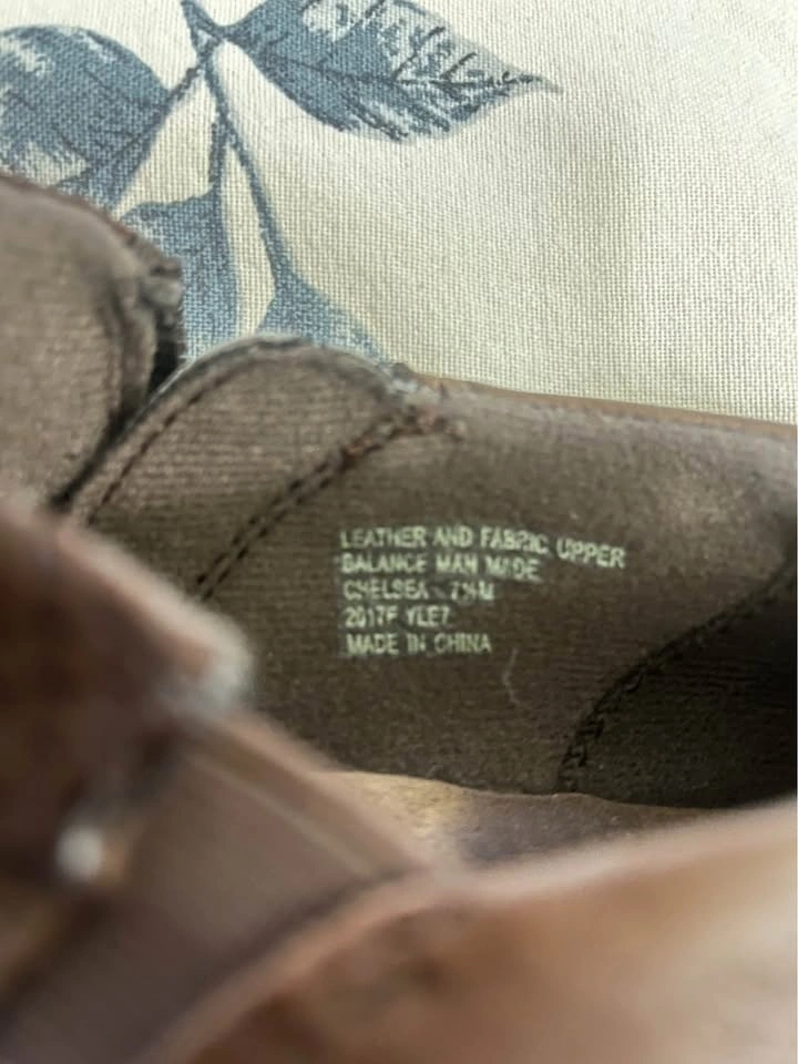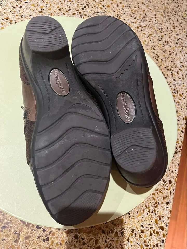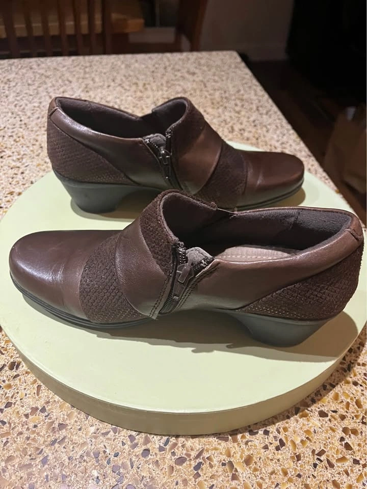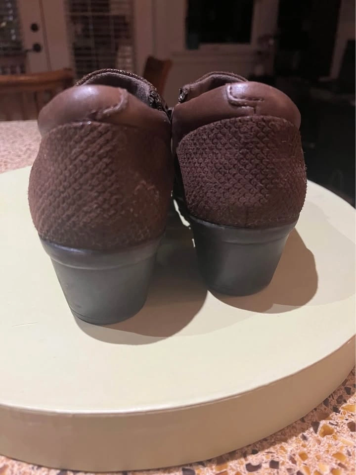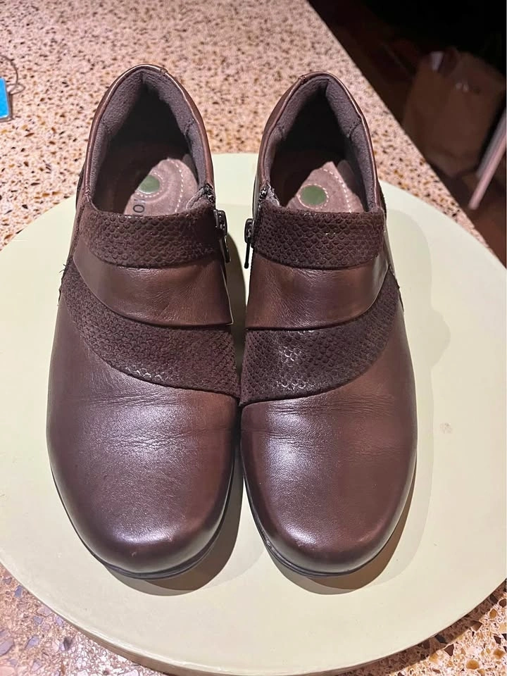 Size 7.5. Brown leather uppers with lovely fabric detailing and side zipper for easy in and out.