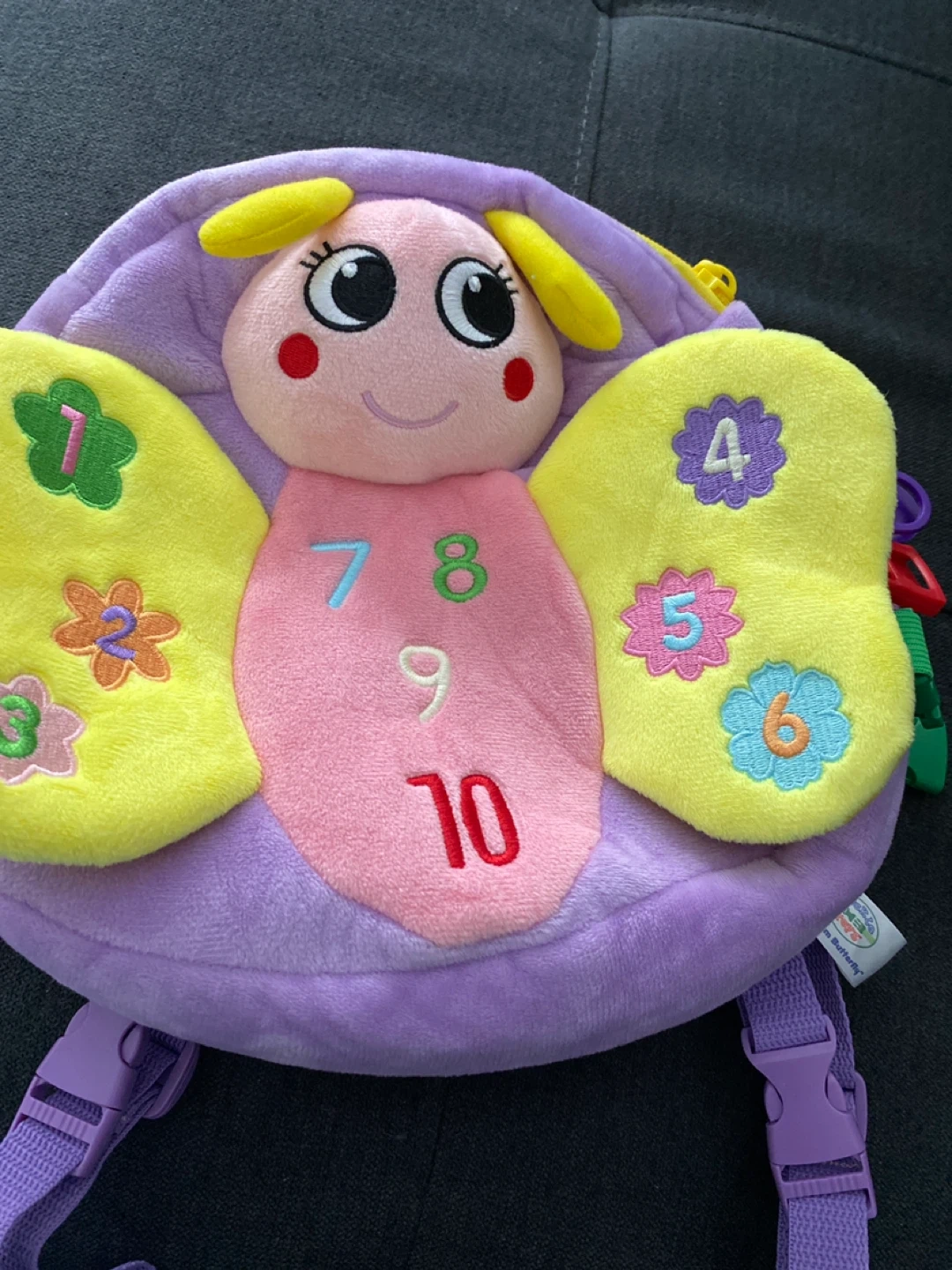Selling a cute Buckle Me Toys Blossom Butterfly backpack! It's in great condition and perfect for little ones learning their numbers and colours. The backpack features colourful wings with numbers and cute flower details.
