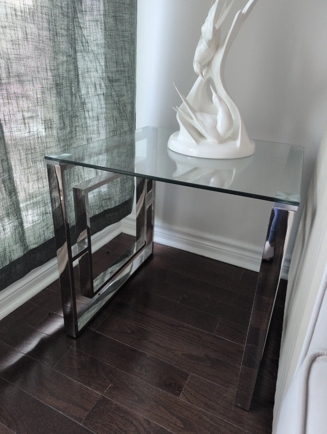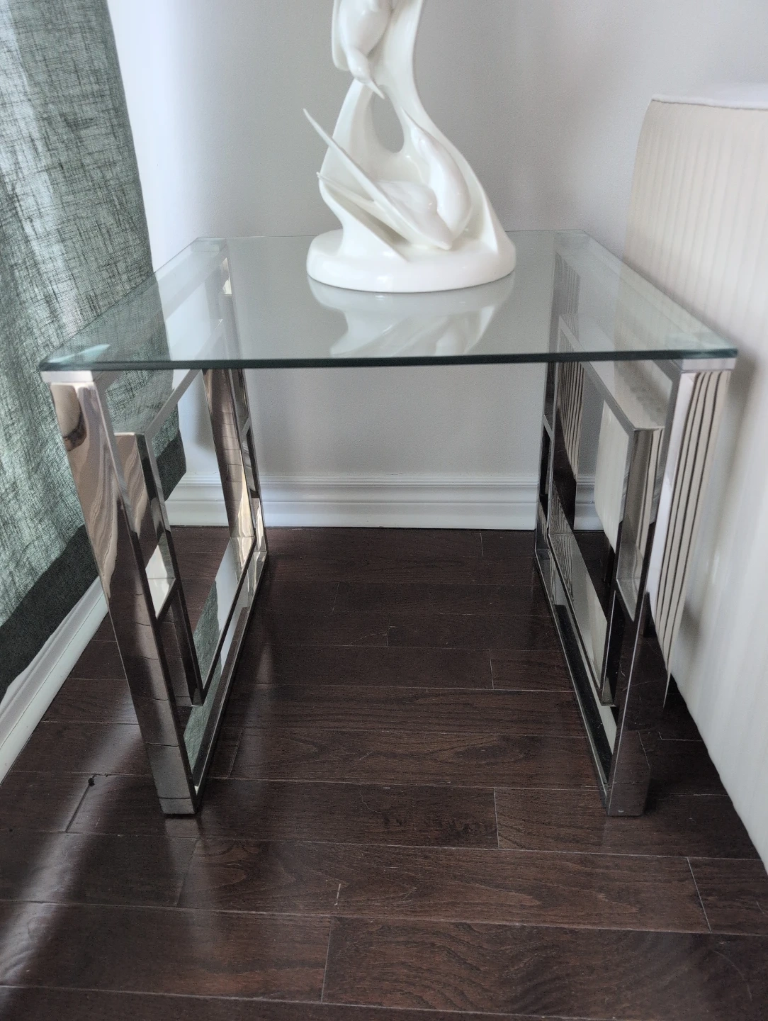 Selling a stylish side table featuring a clear glass top and a modern chrome base. It's in great condition and would look lovely in any living room or bedroom! The clean lines and reflective surfaces add a touch of elegance to your space