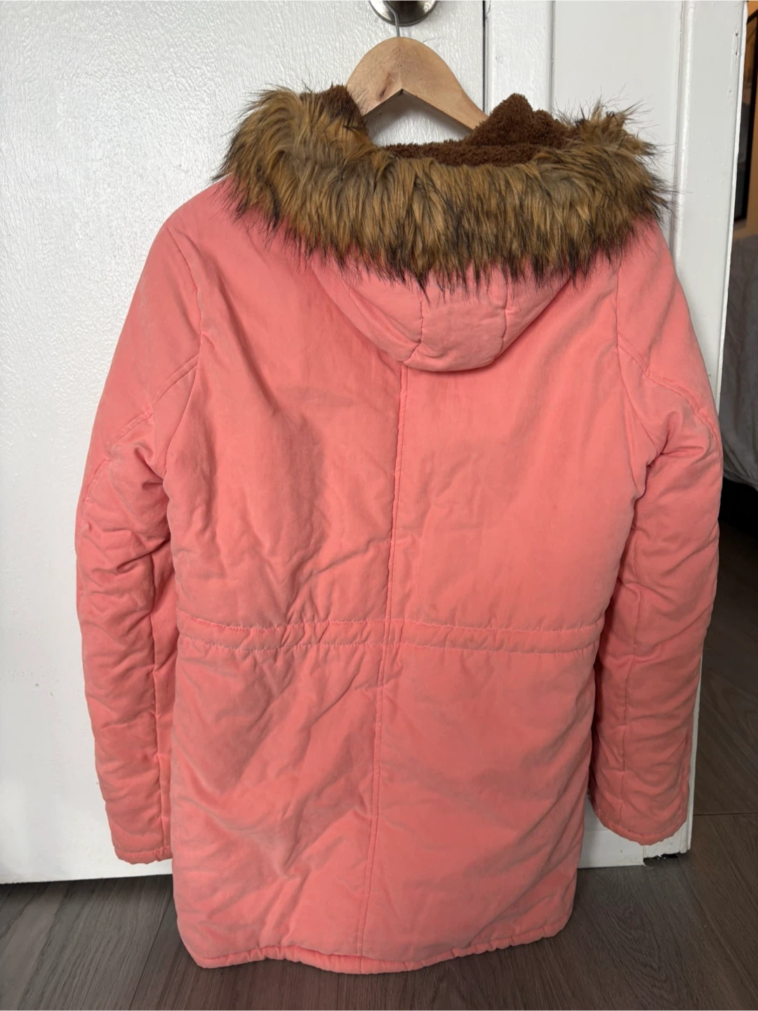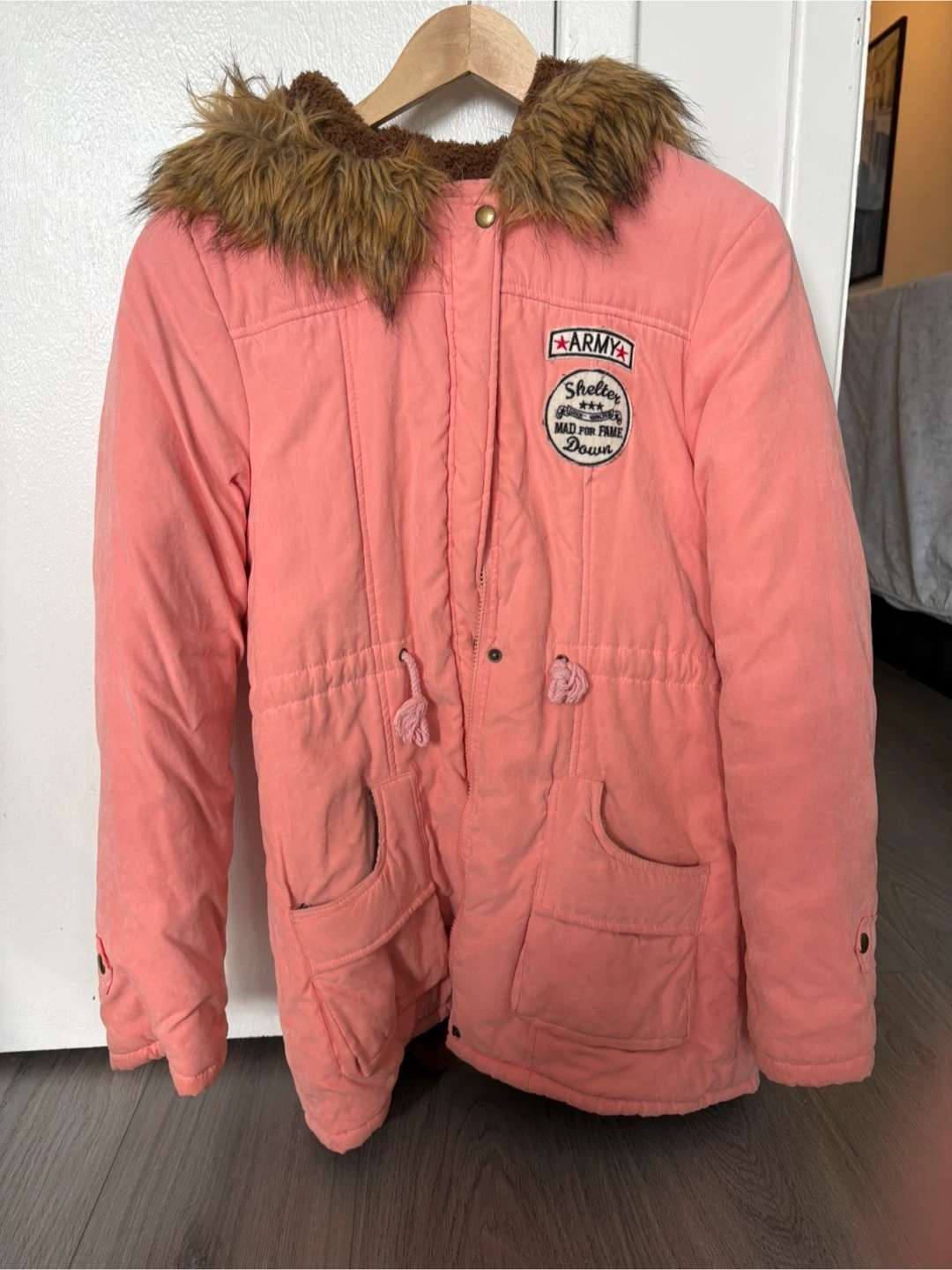 Giving away a cute pink warm jacket with an army-style patch! It features a faux fur-lined hood and a drawstring waist for a snug fit. Perfect for keeping warm on chilly days!
