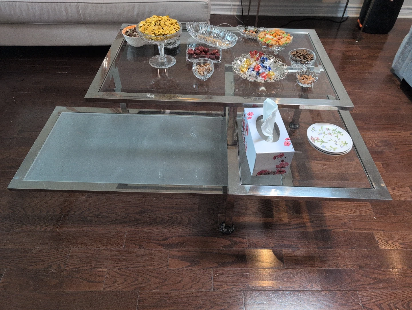 Selling a coffee table with a glass top and chrome frame. It has a modern look with three different tiers and would be a great addition to any living room. In good condition.