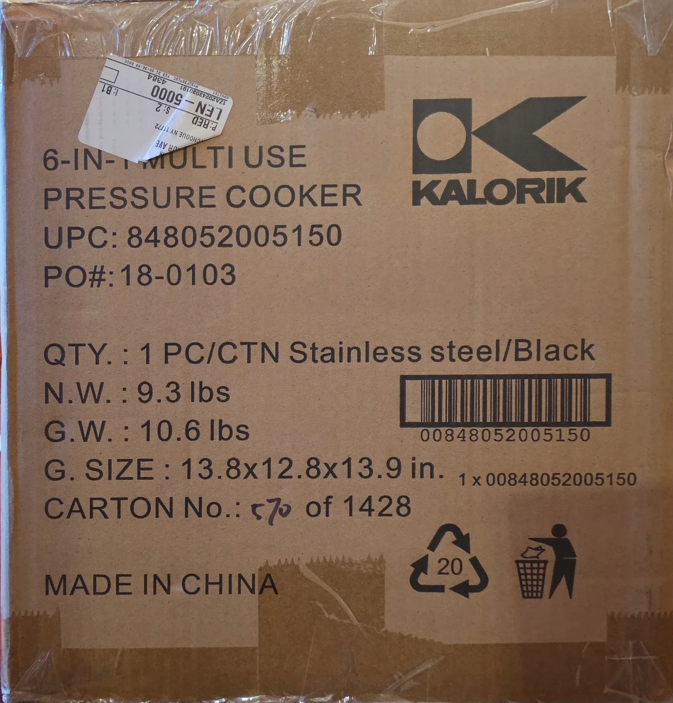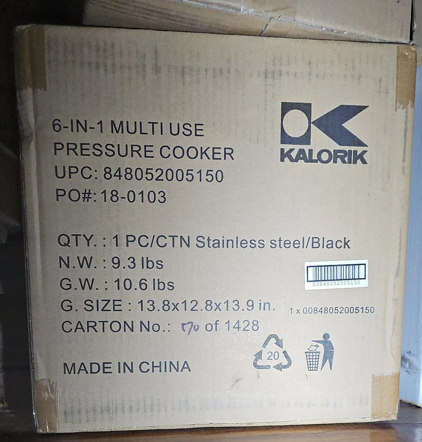 Selling a brand new Kalorik 6-in-1 Multi Use Pressure Cooker! It's stainless steel and black, still in its original packaging. The box measures approximately 13.8 x 12.8 x 13.9 inches and weighs 10.6 lbs. Perfect for versatile cooking! Never opened.