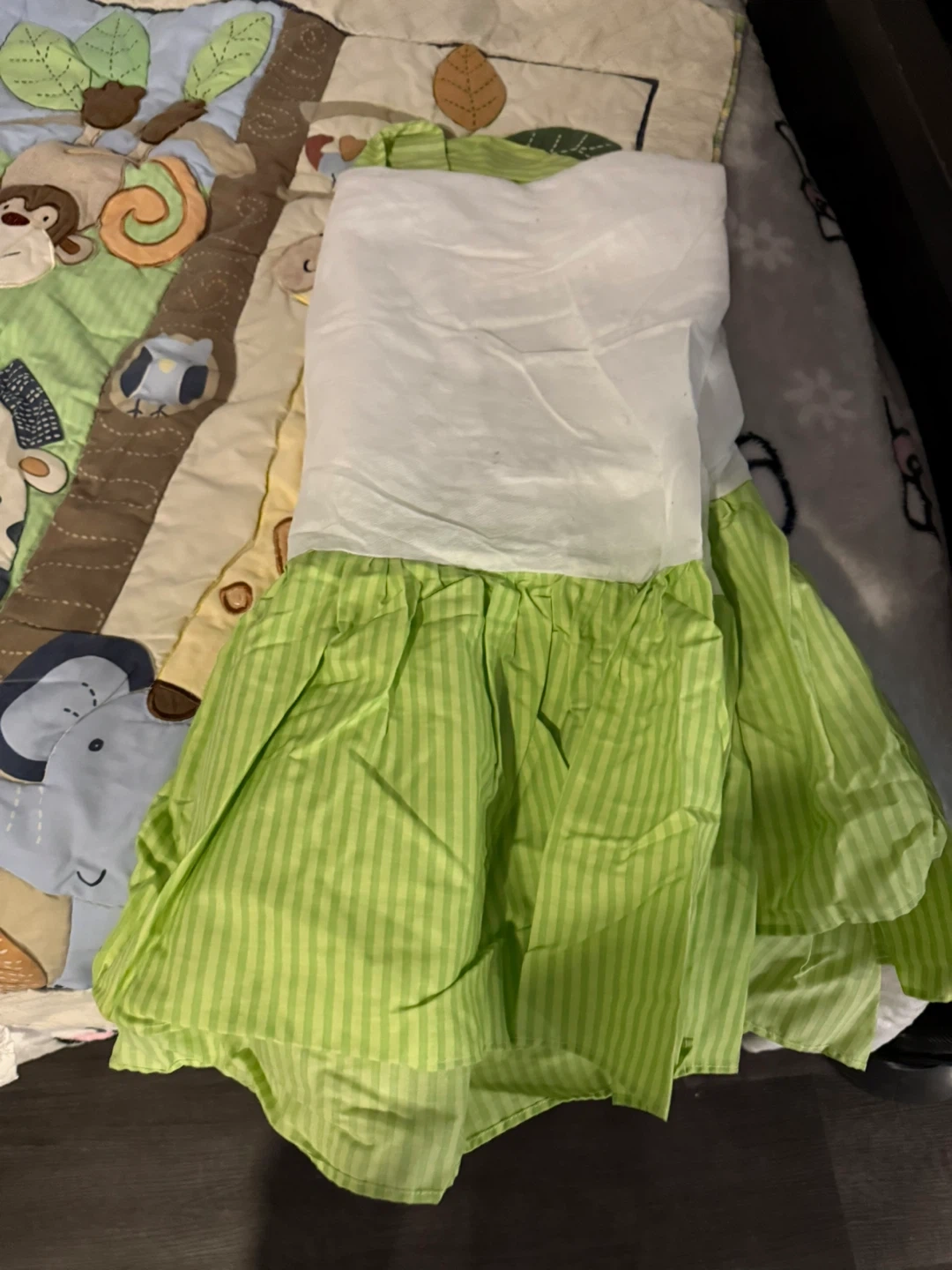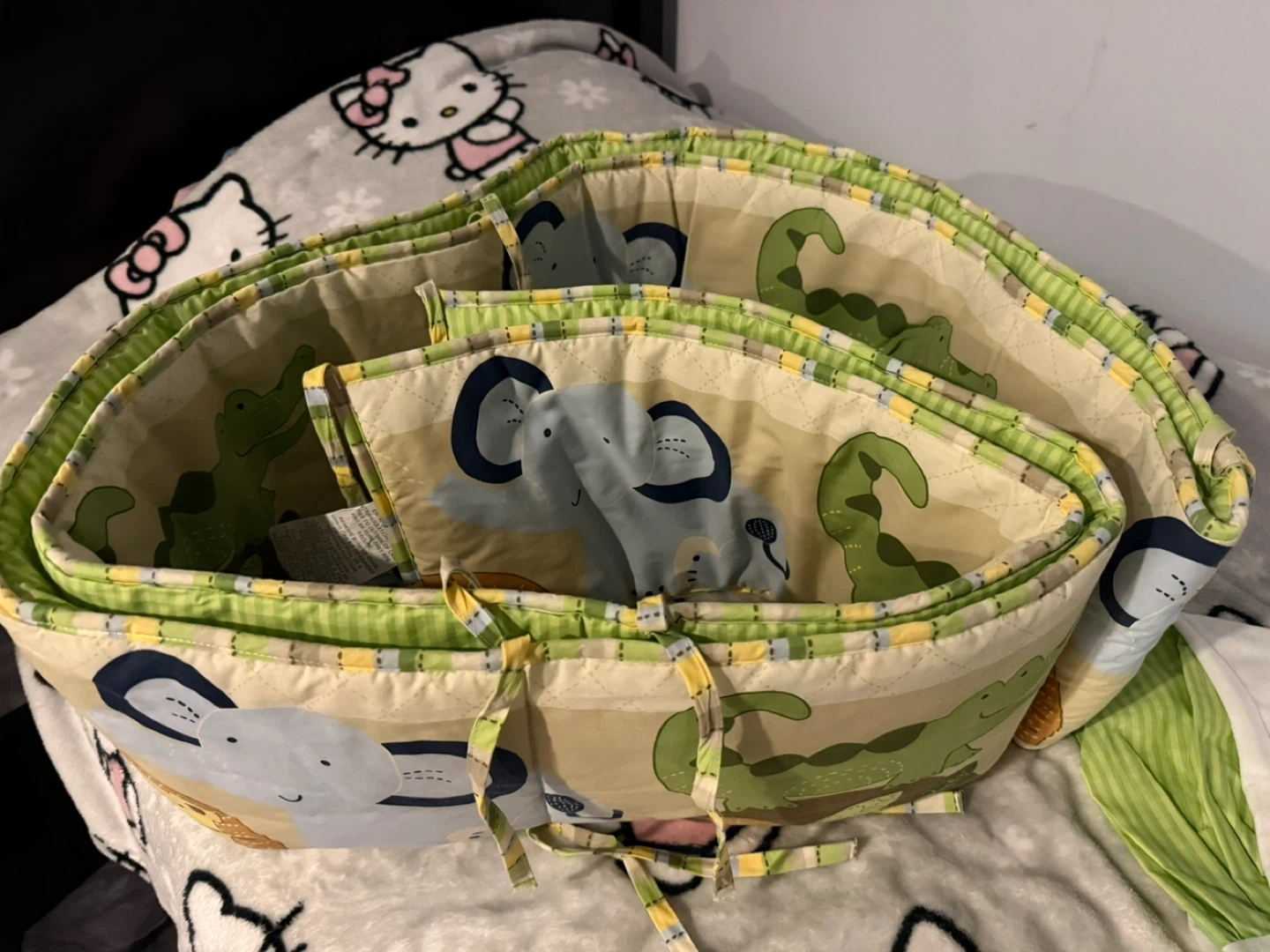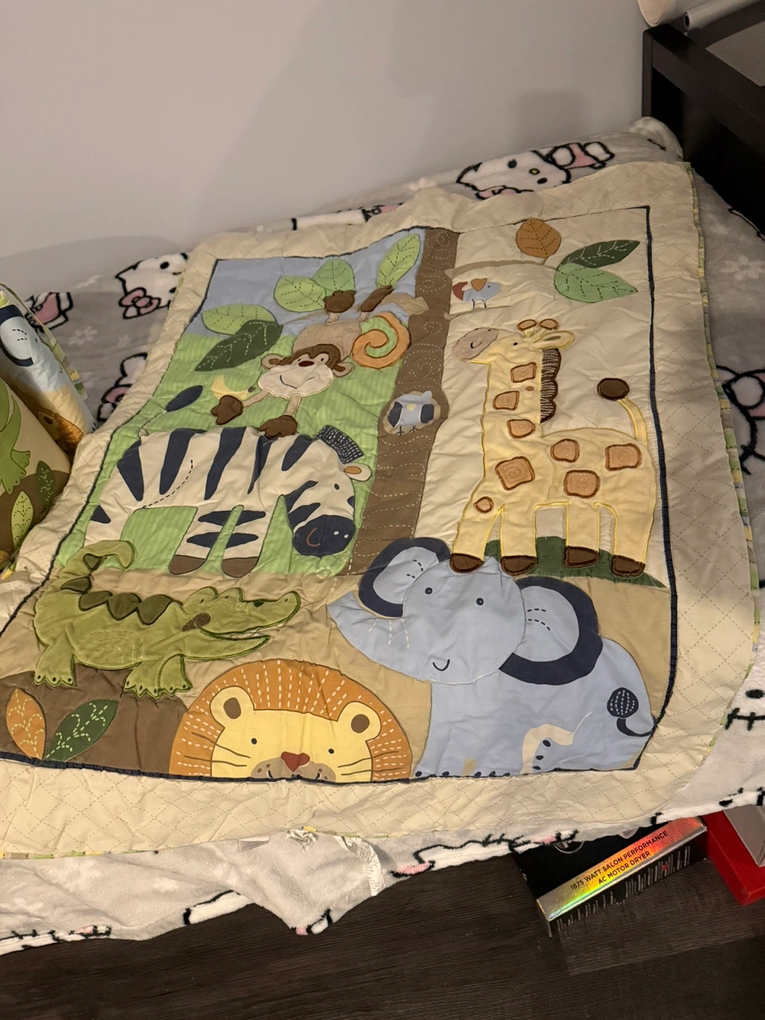 Selling a Lambs & Ivy Jungle Story 3-piece infant safari tan baby crib bedding set. It features adorable jungle animals like elephants, lions, and giraffes. The set includes a quilt, fitted sheet, and crib skirt. Perfect for creating a cozy and cute nursery!