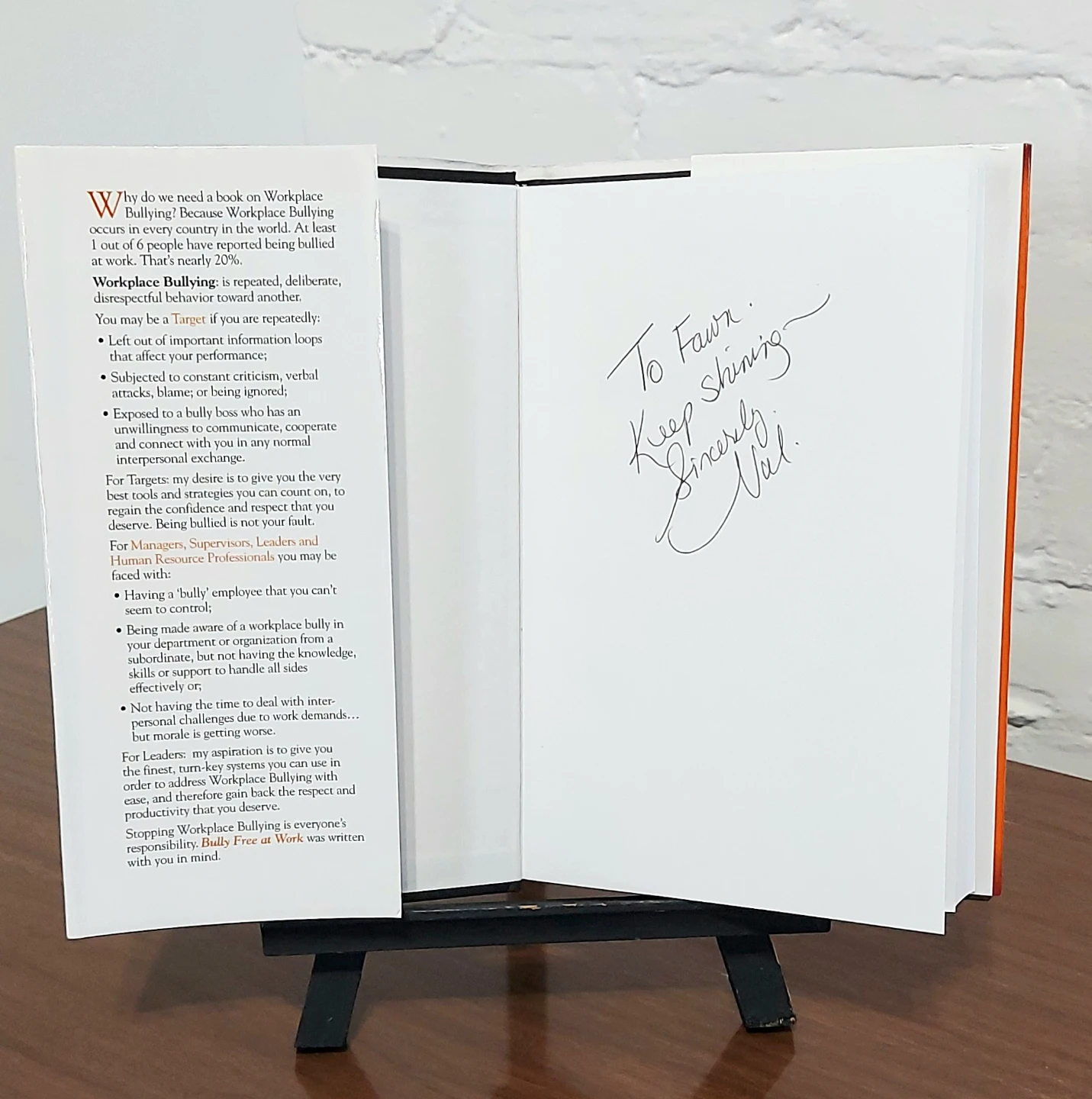 Bully Free at Work by Valerie Cade hardcover book. In very good/excellent condition. Autographed by the author (see photo). From a pet free and smoke free home.