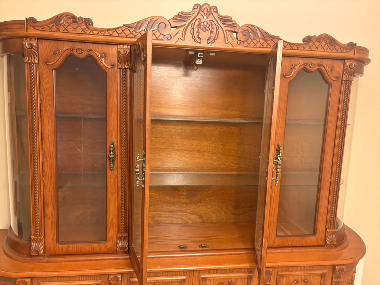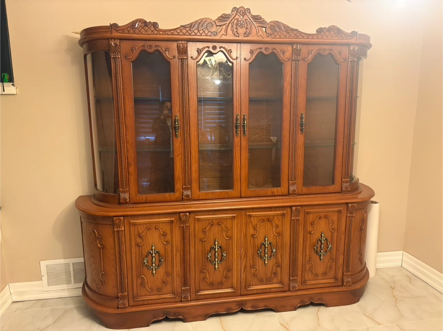 Selling a beautiful vintage wooden china cabinet! It's in great condition and would be a lovely addition to any dining room or living space. The cabinet features glass doors and ornate detailing, perfect for displaying your cherished items.