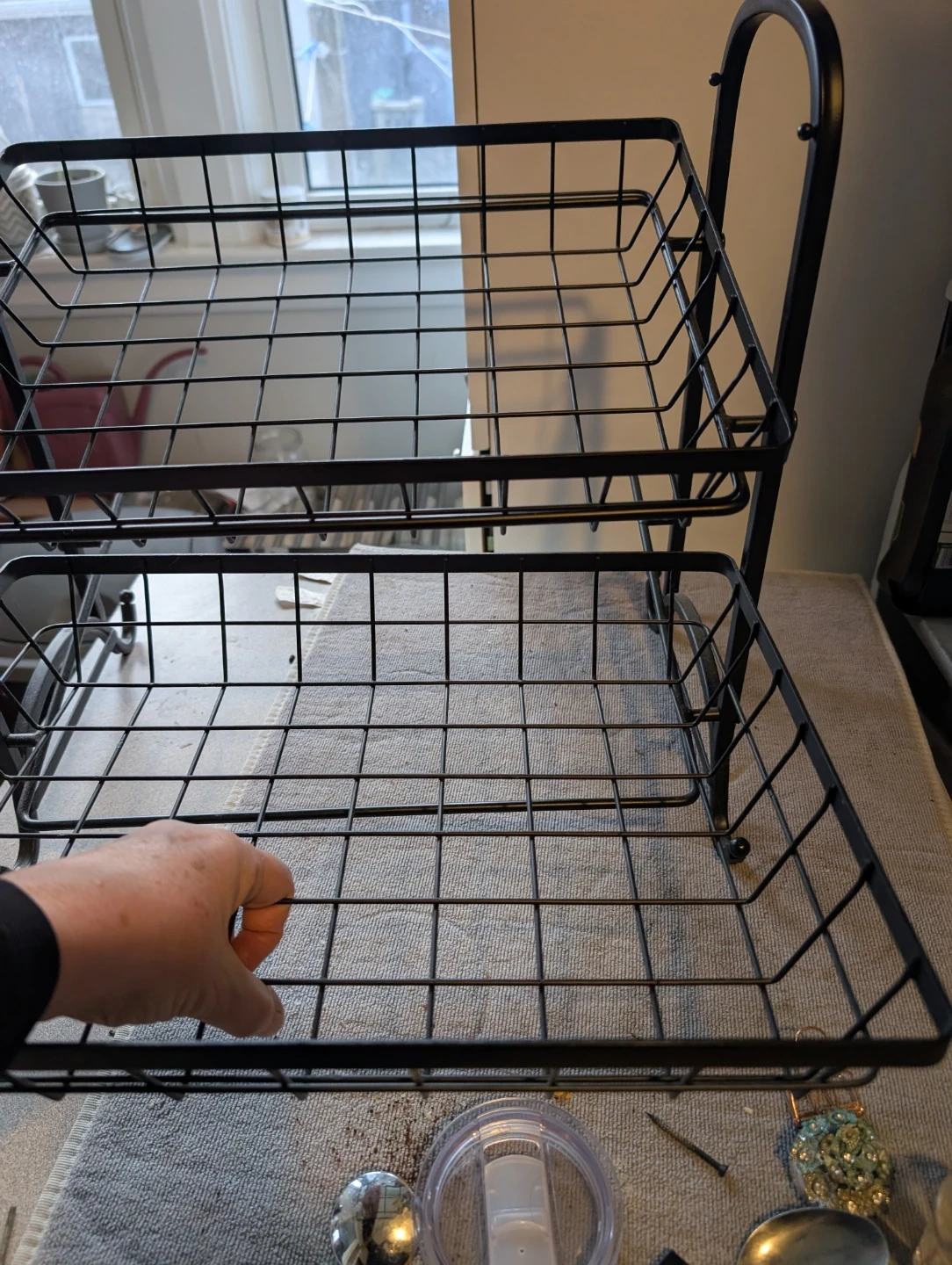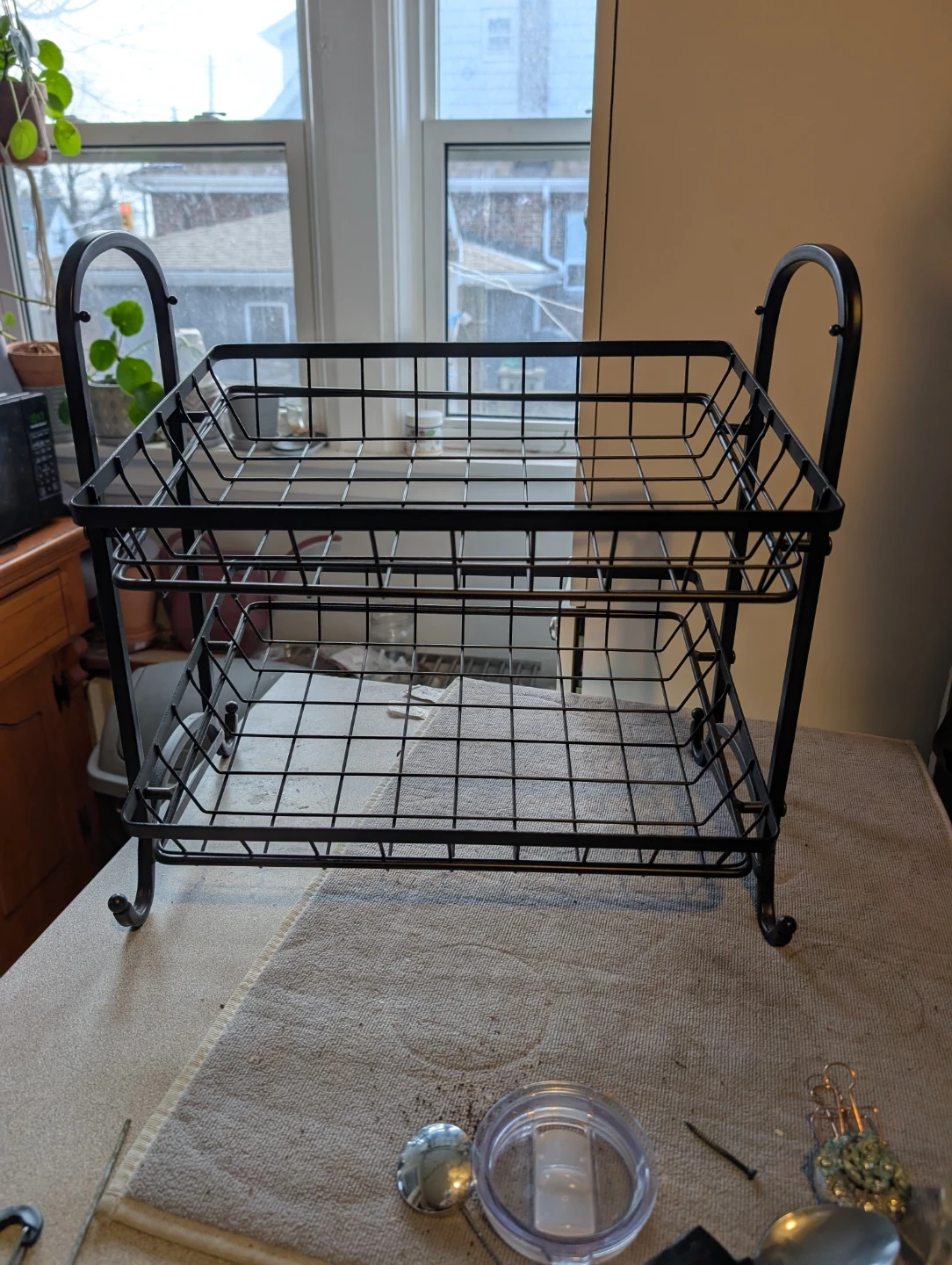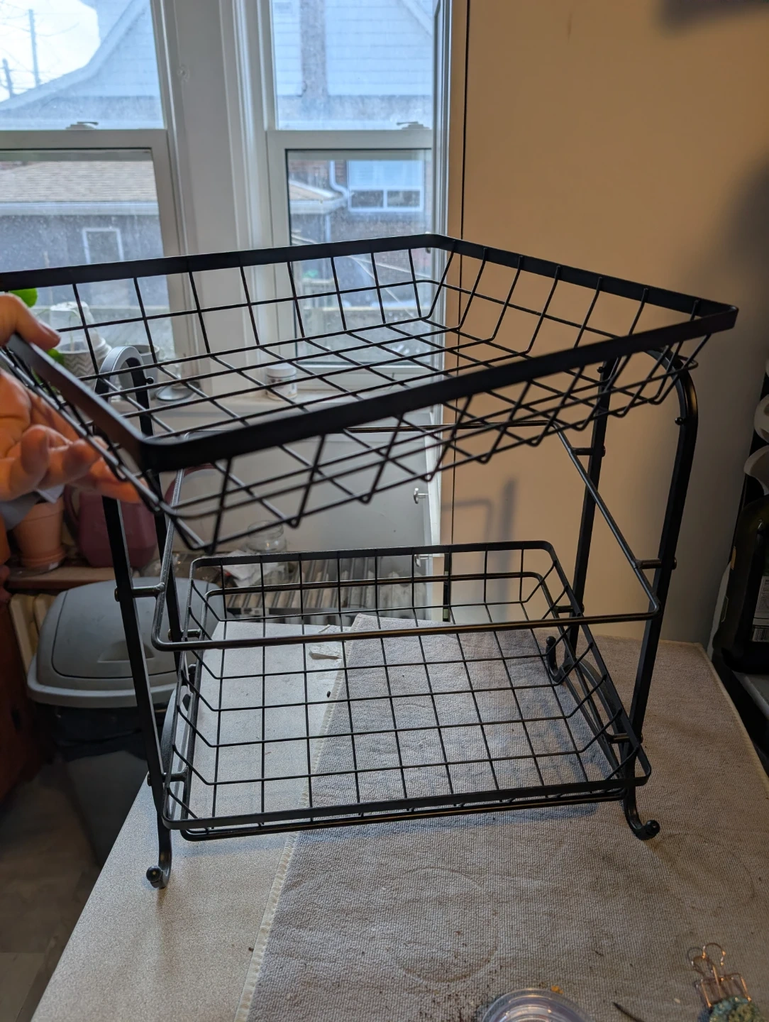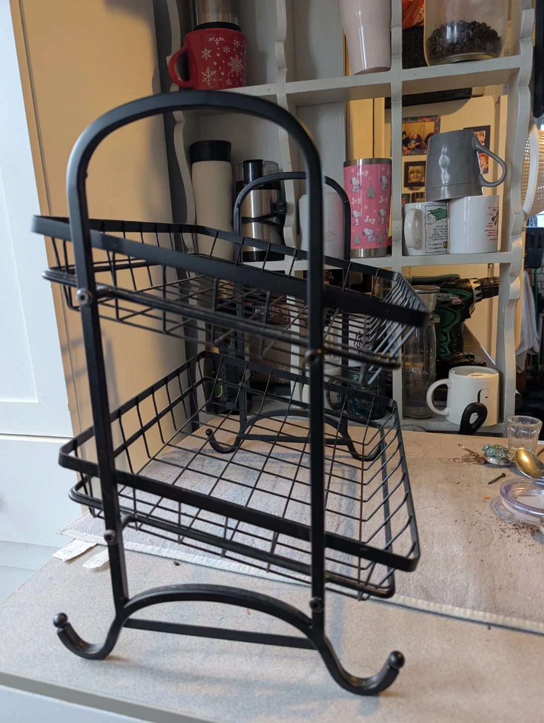 Selling a handy black metal two-tier basket stand! Perfect for baked goodies this Holiday! It's in great shape and perfect for organizing your kitchen or pantry or baked goods. Shelves are on an angle so you can see the entire shelf.