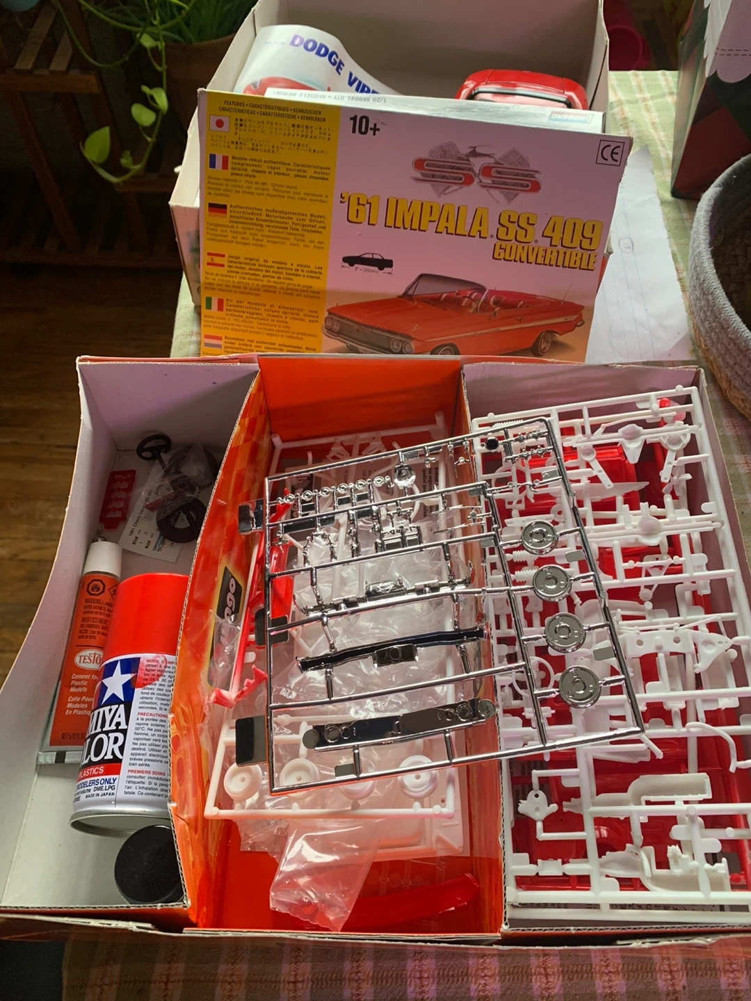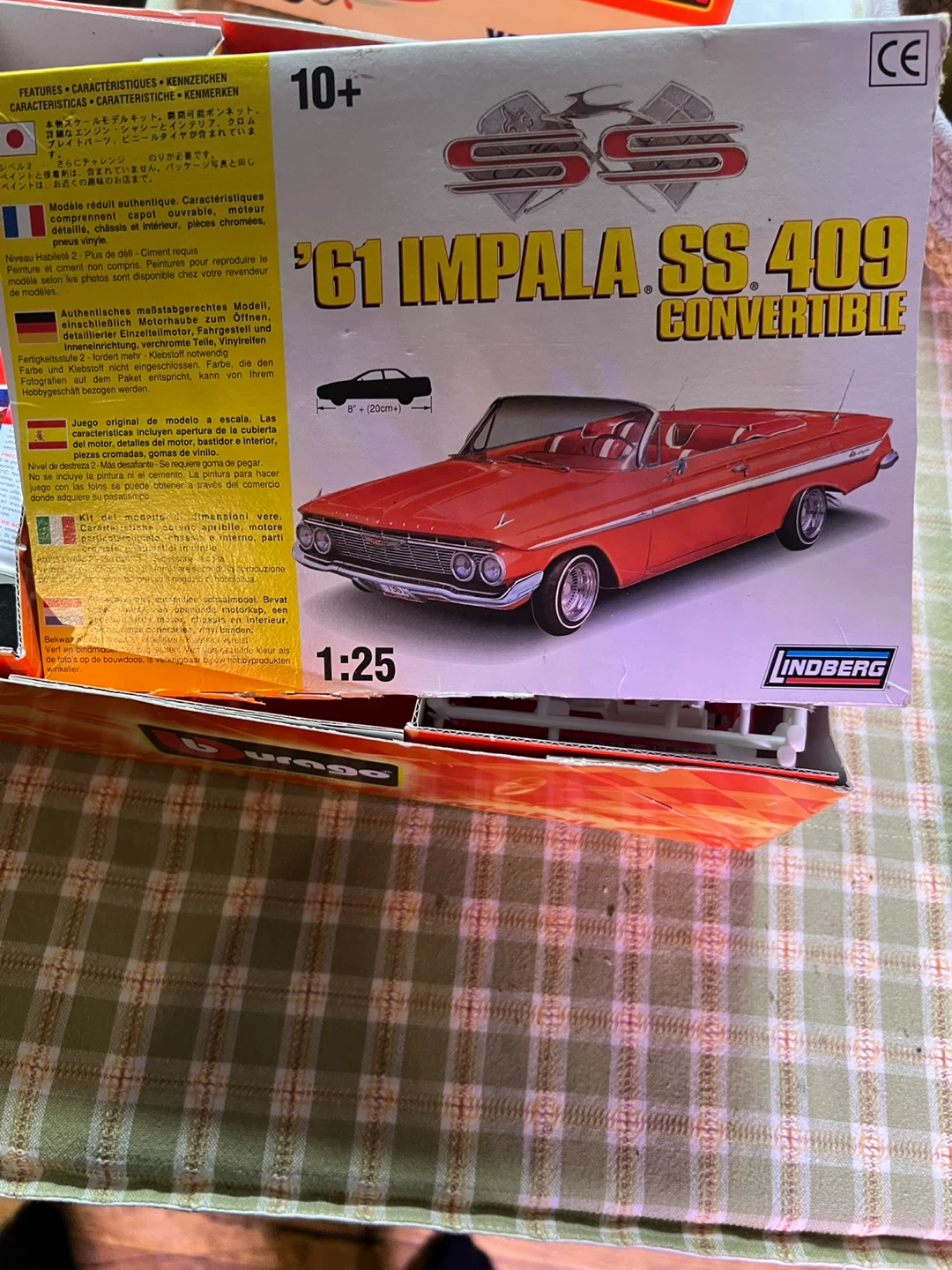 #Gifting a Lindberg '61 Impala SS 409 Convertible model kit! It's recommended for ages 10+. The scale is 1:25. It comes with all the pieces still in their original packaging, as well as the box