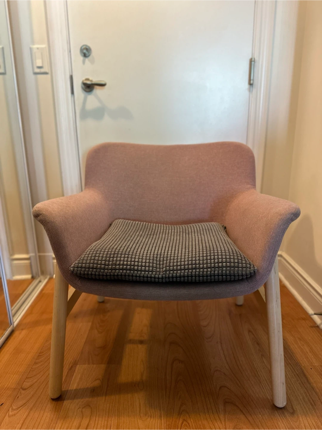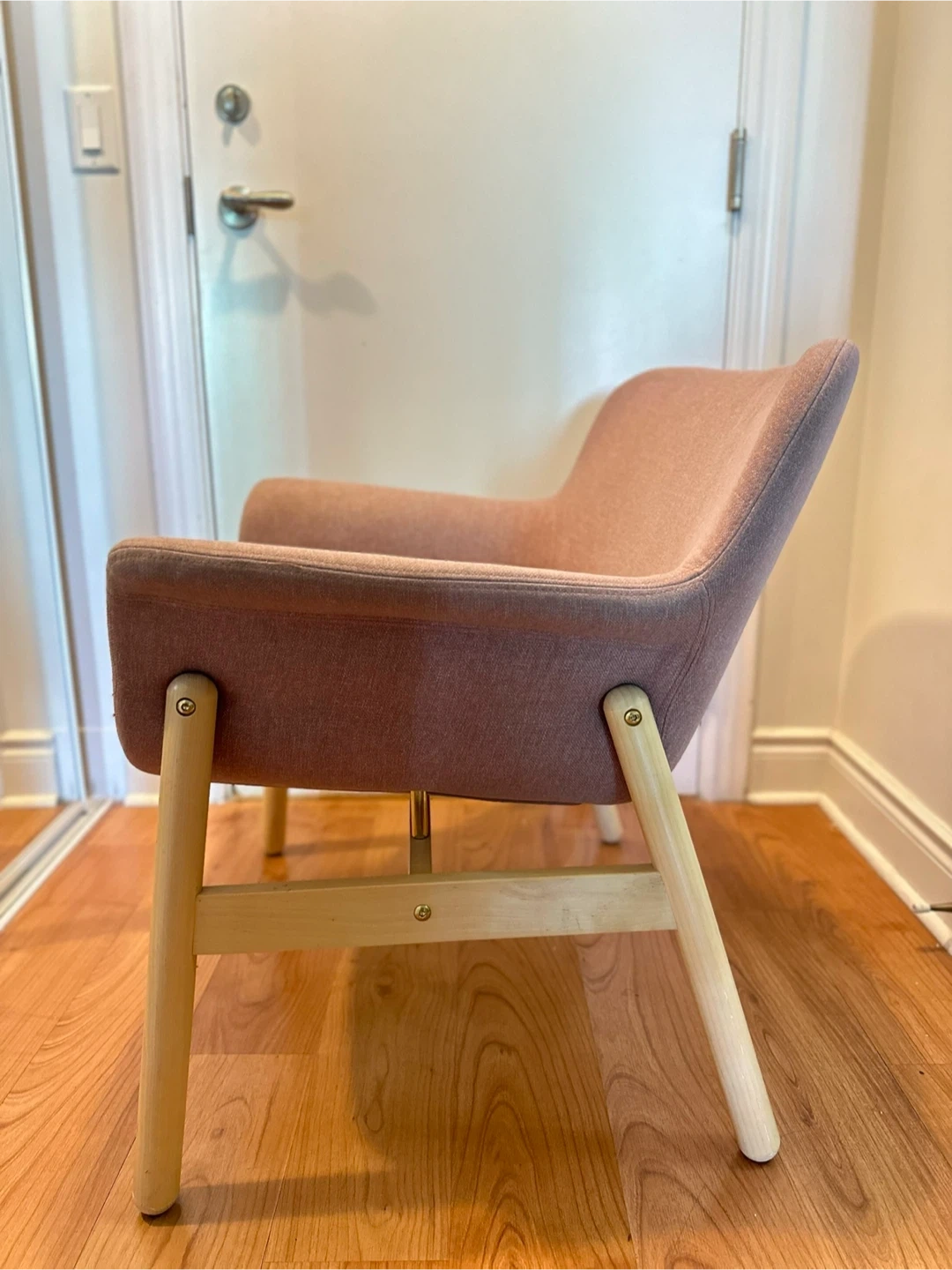 Here's a lovely armchair with a blush pink fabric and natural wooden legs! It's in great shape and would look great in any room. Perfect for adding a touch of cozy charm to your home