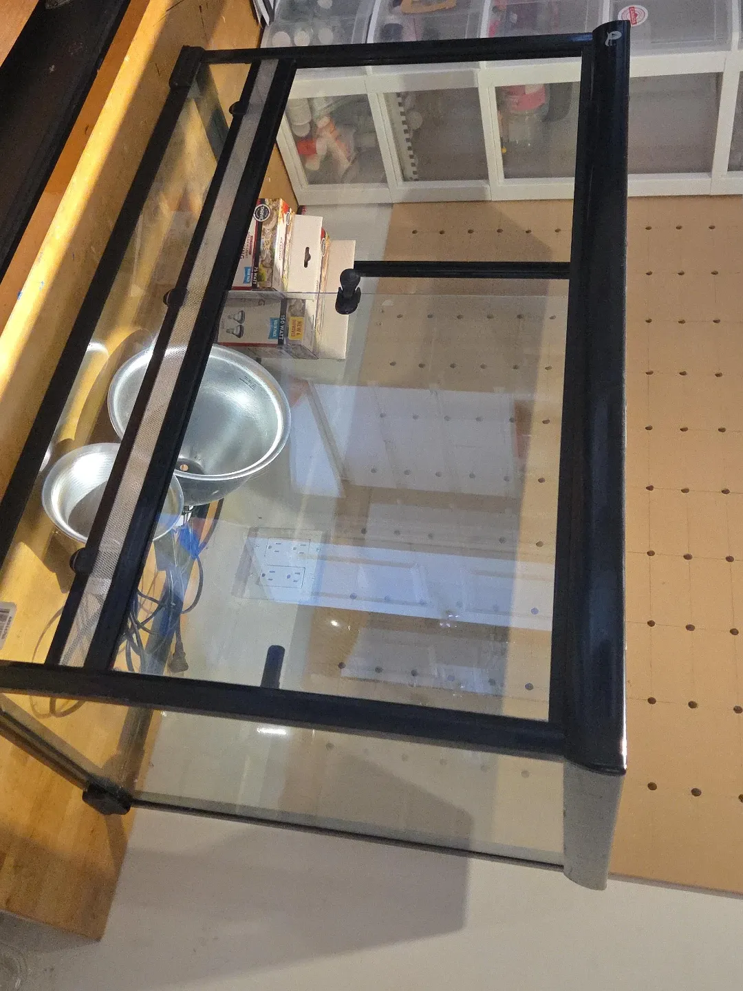 Selling a 64 gallon terrarium with basking light fixtures and bulbs (2x75w and 1x150w). Perfect for reptiles or other small animals.