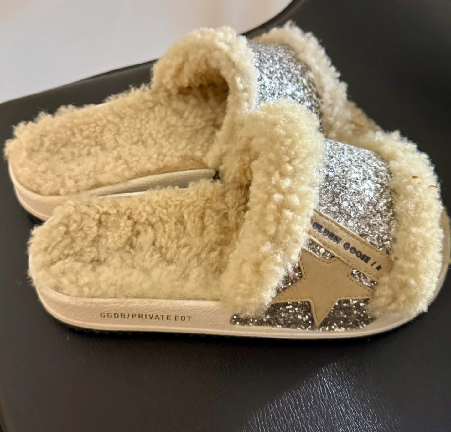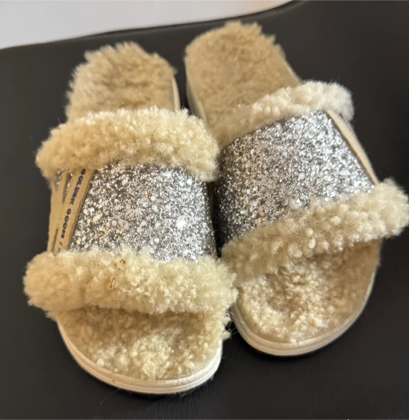 These Golden Goose slides are super cute and comfy! They feature a glittery design with a fluffy trim. Perfect for adding a touch of sparkle to your everyday look