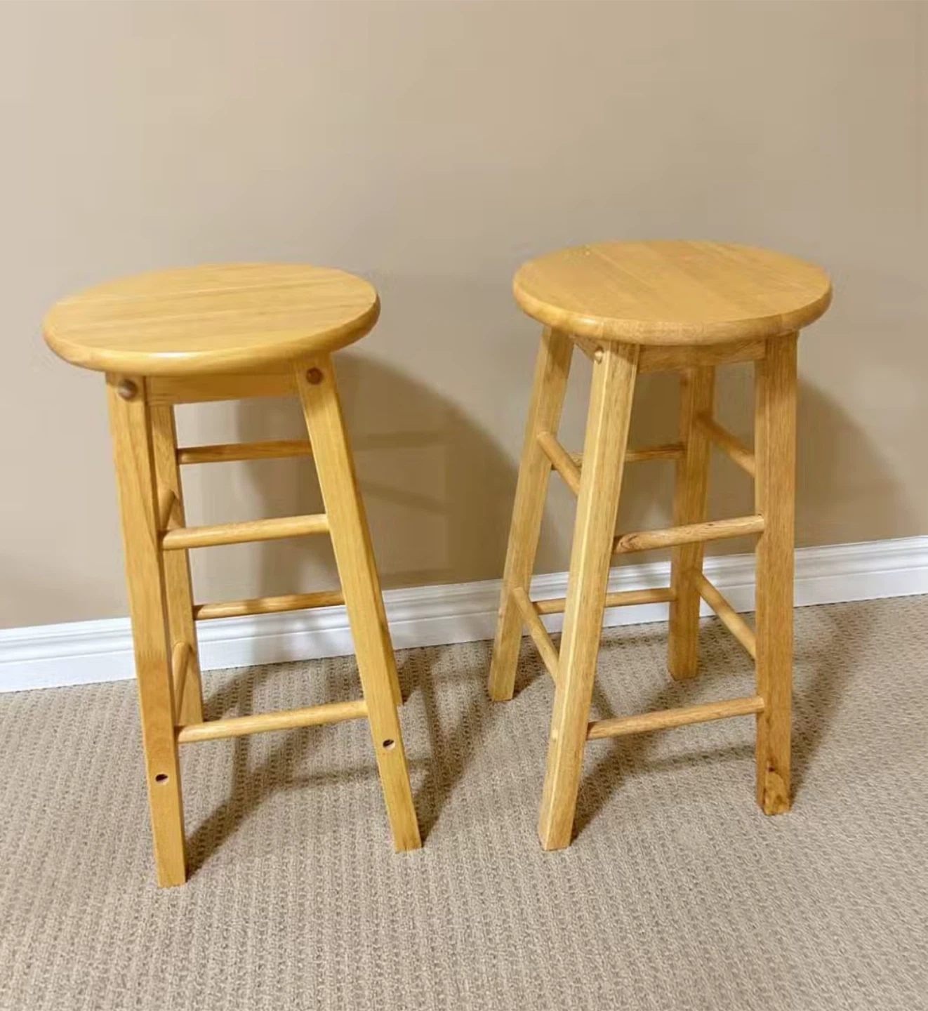 Selling a set of two wooden bar stools! They're in good condition and ready for a new home. Perfect for adding some extra seating to your kitchen or bar area