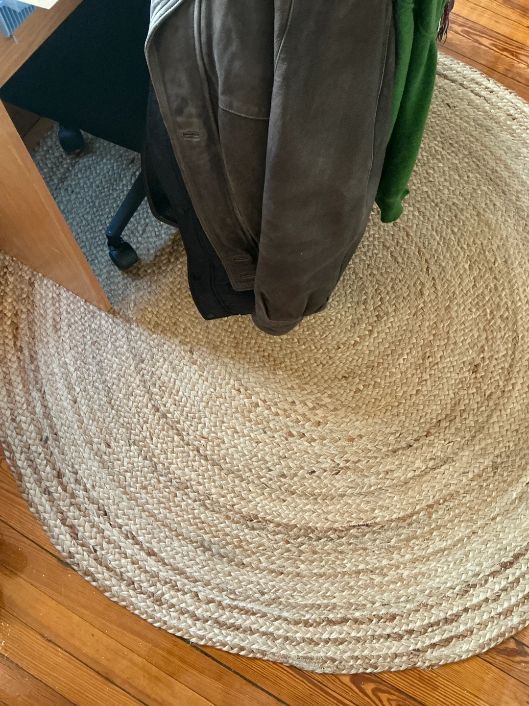 Selling a round jute rug! It's in good condition and would look great in any room. The rug is made of natural jute material.