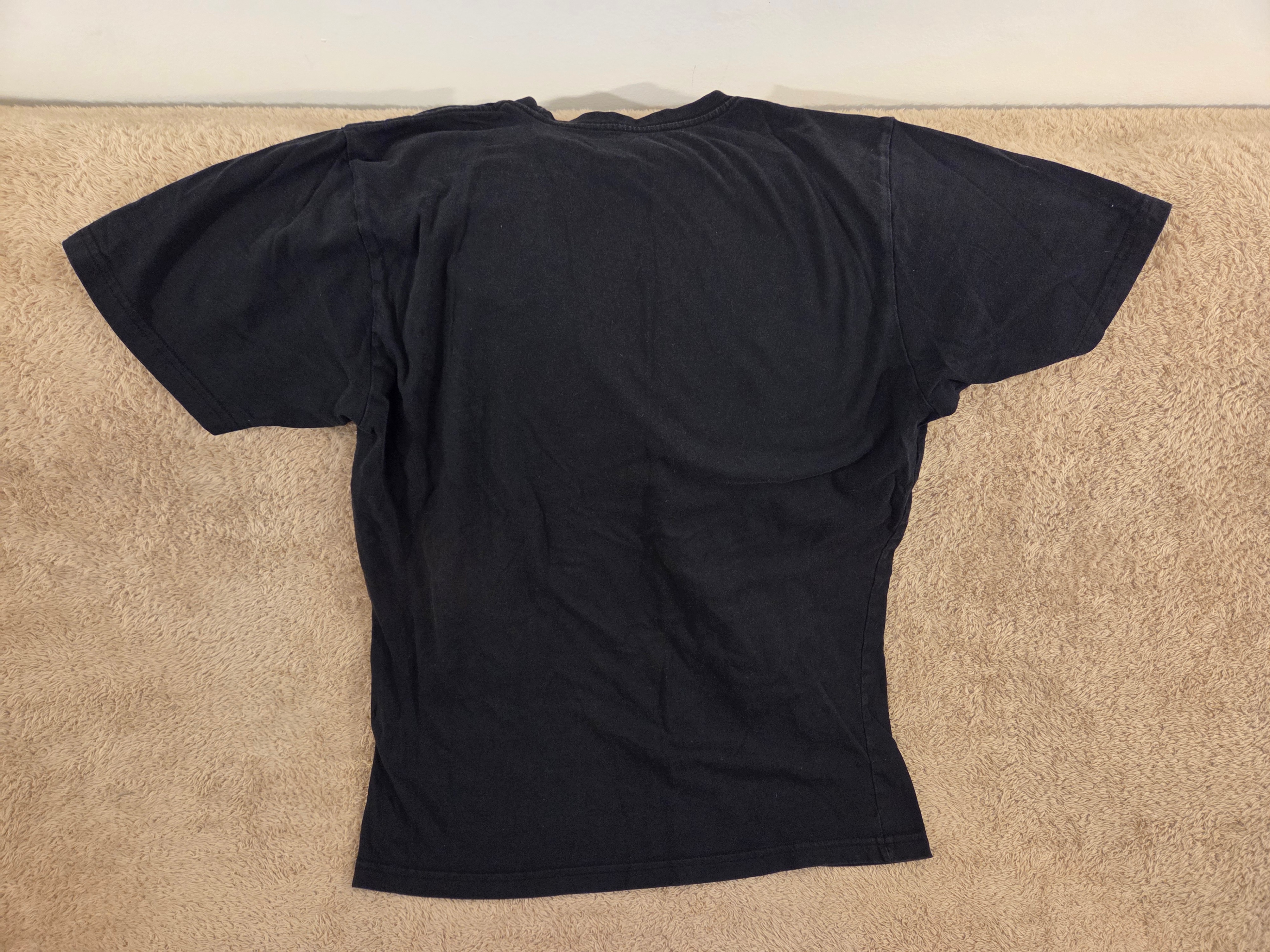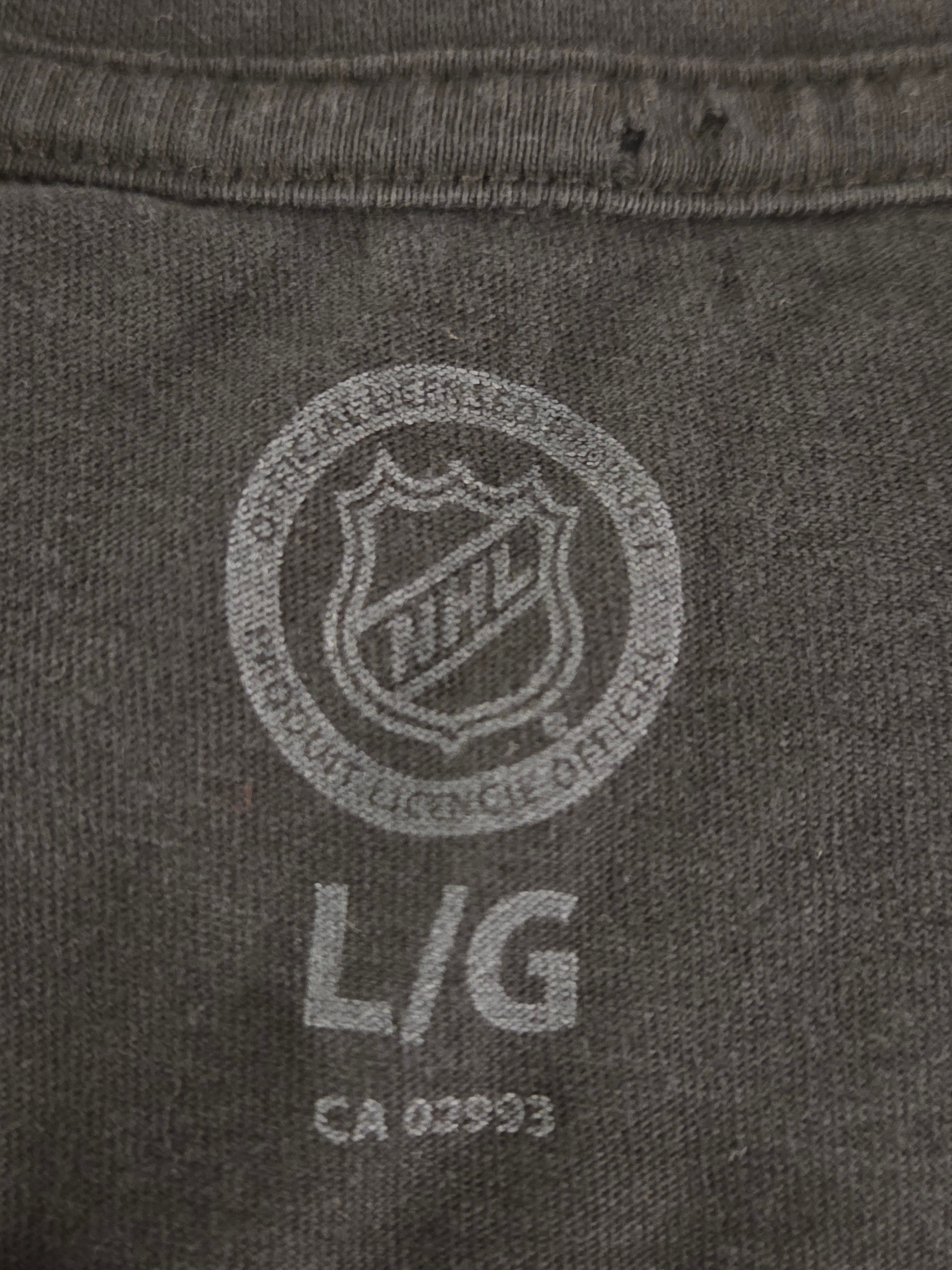 Official Toronto Maple Leafs NHL short-sleeve tee in black, tagged size L/G. Classic leaf crest in grey with blue outline. Soft cotton-jersey feel with tagless neck print (NHL Official Licensed Product). Pre-owned and gently worn with natural wash fade; graphic still looks good with minor cracking from normal wear – no major flaws noticed.