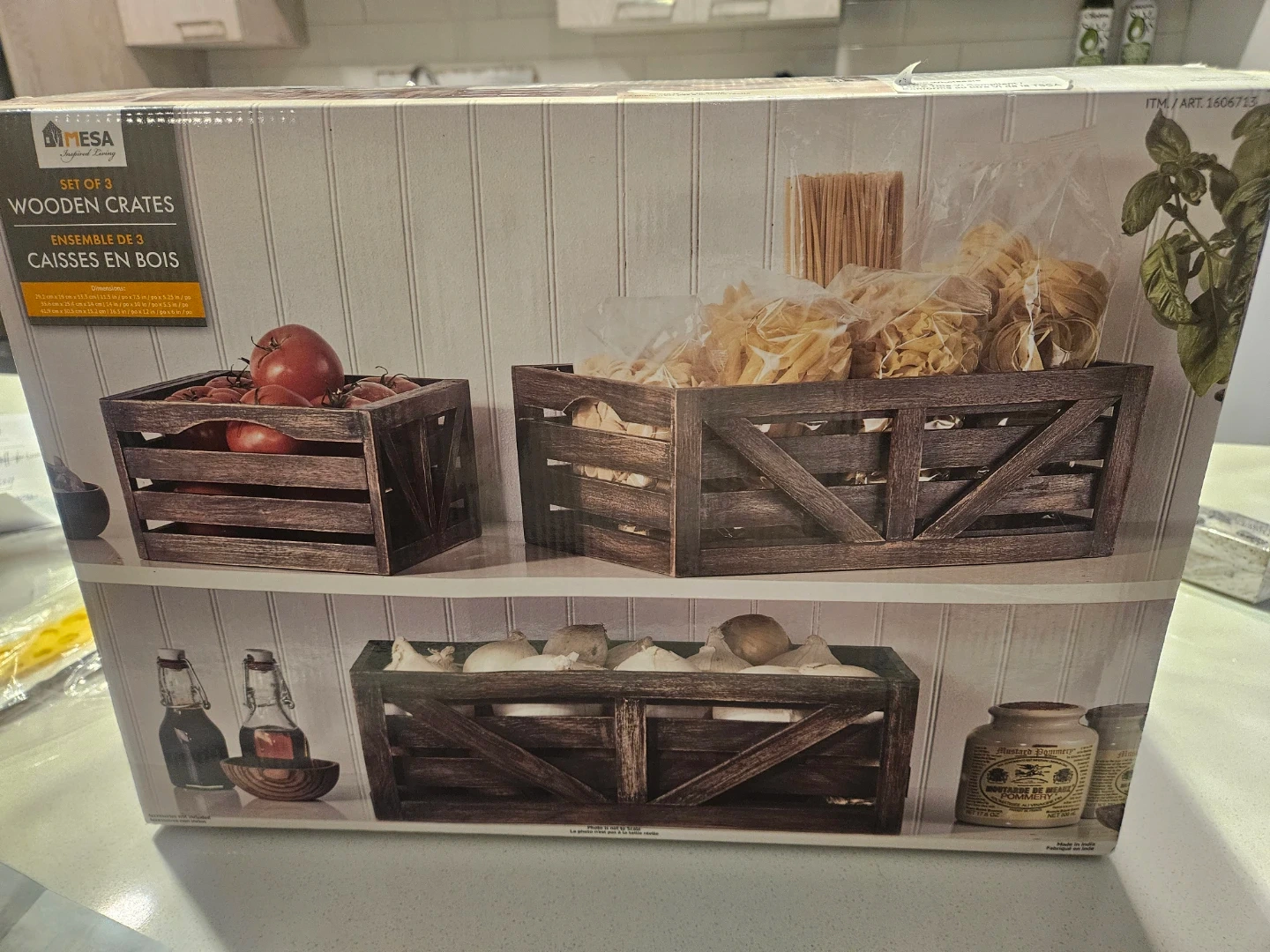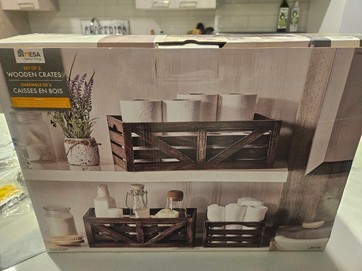 Selling a brand new set of three Mesa Living wooden crates! These crates are perfect for adding a rustic touch to your home decor or for organizing items in your kitchen, bathroom, or living room. They come in their original box, ready to use or gift