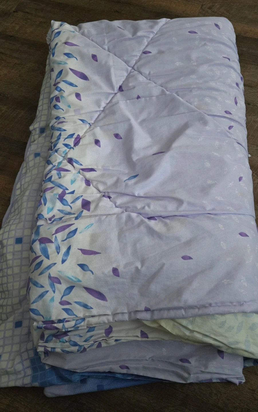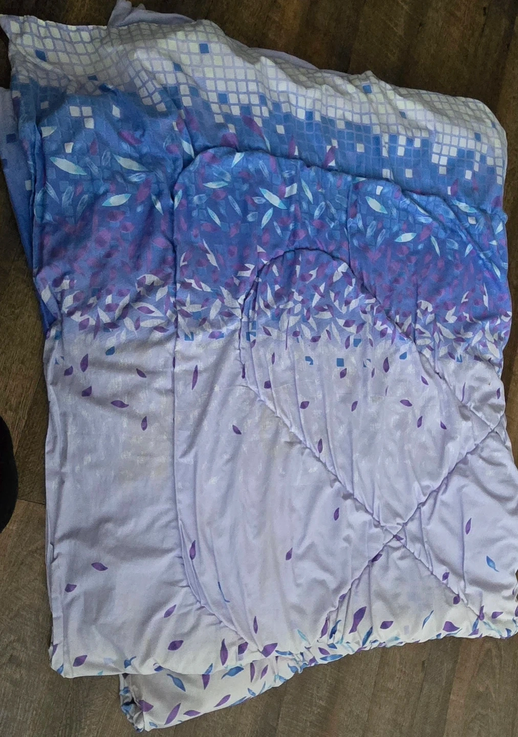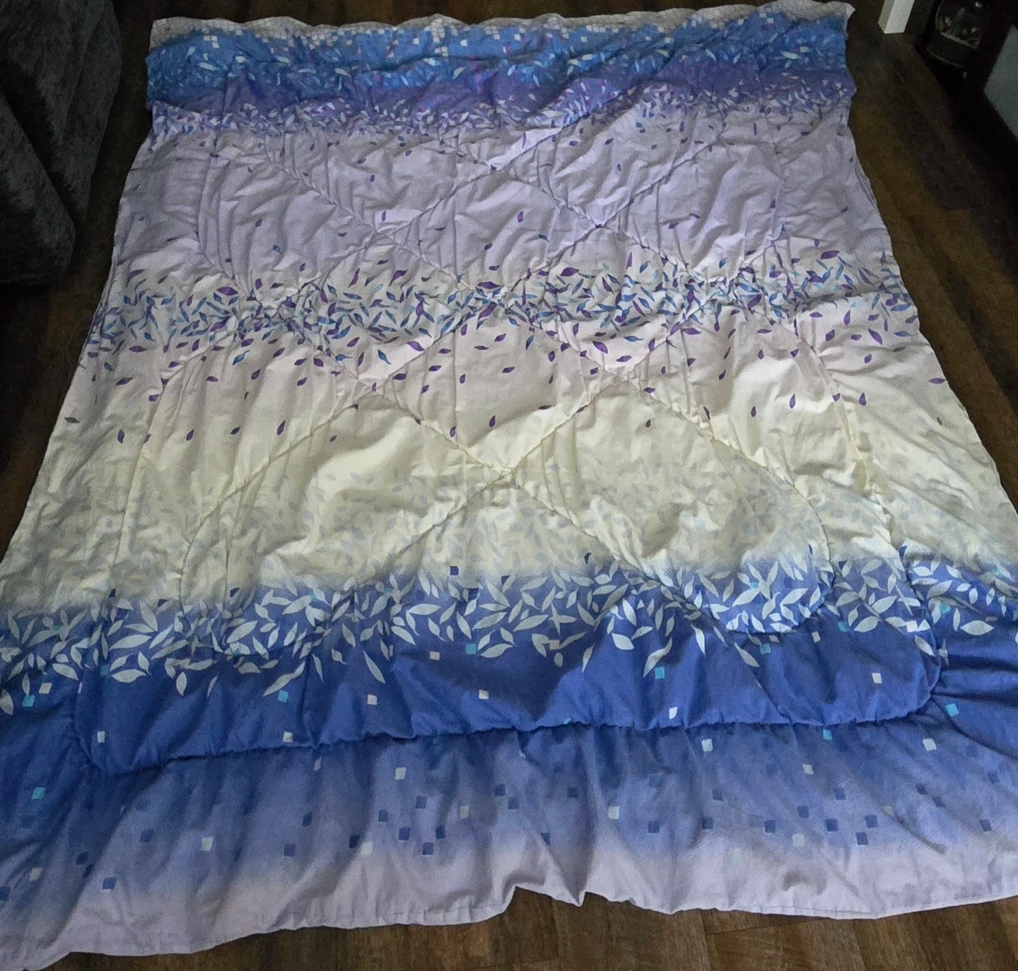 Here's a lovely comforter with a pretty floral pattern in shades of purple and blue. It's in great shape and ready to keep you cozy!