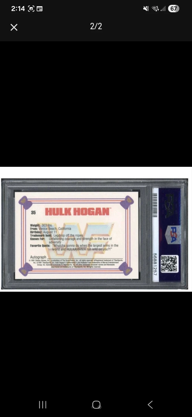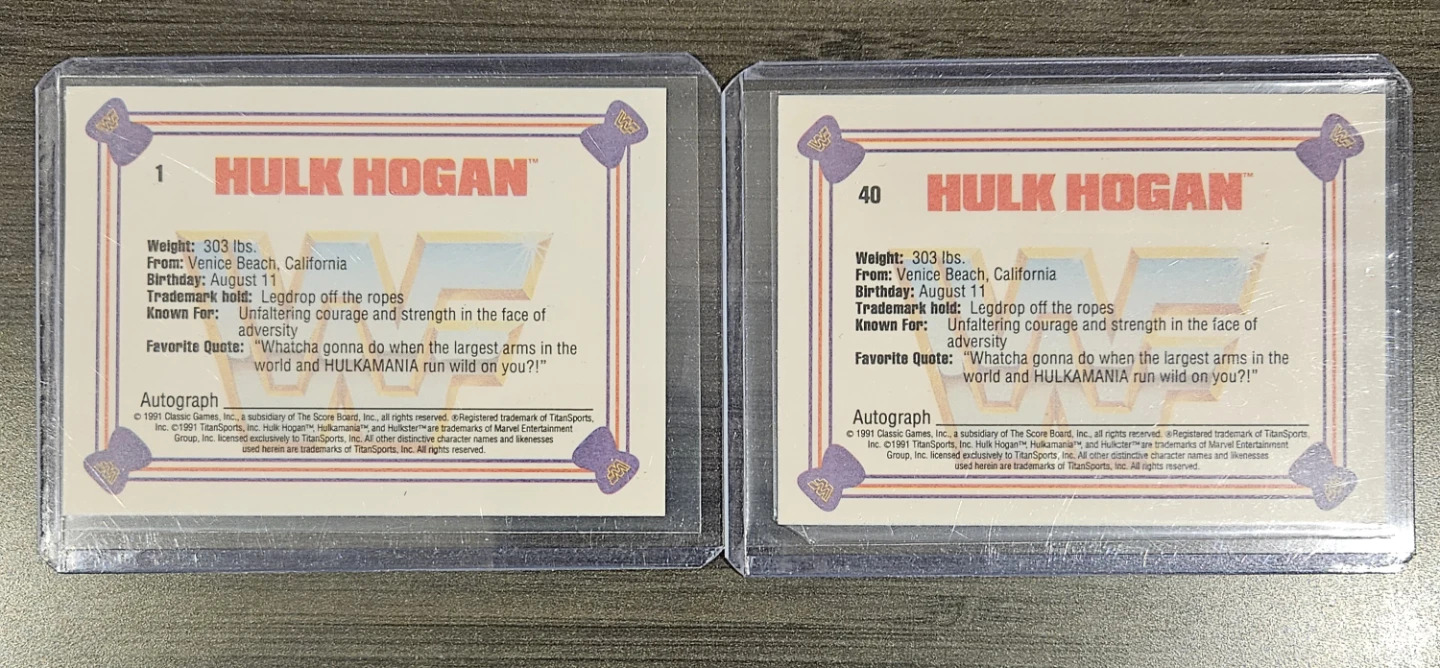 Selling two Hulk Hogan 1991 Classic WWF trading cards. Card numbers are 1 and 40. Great for any wrestling fan! With a PSA. E-transfer. Shipping Only.
