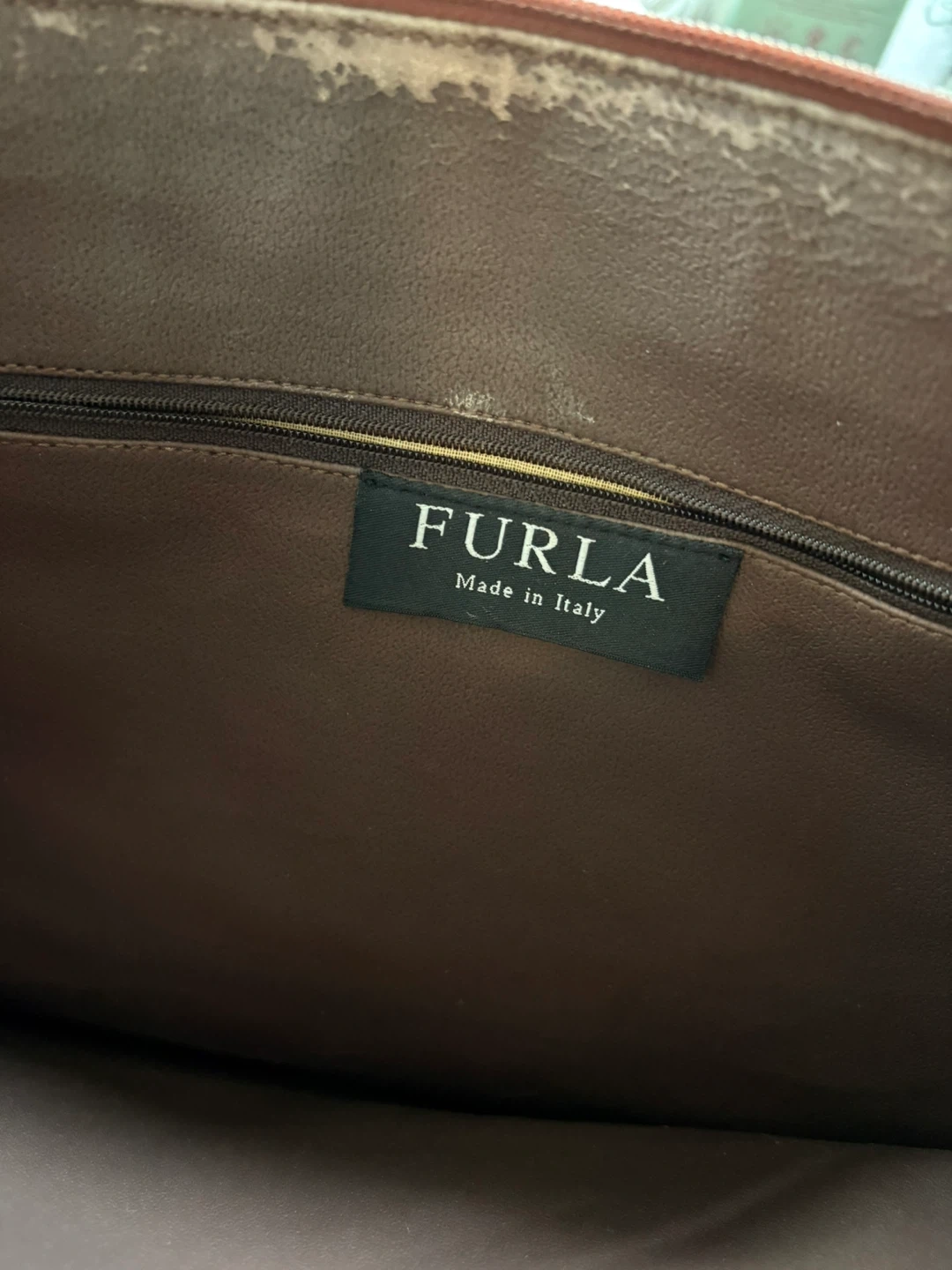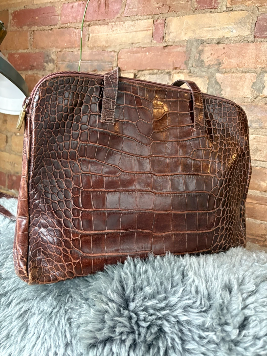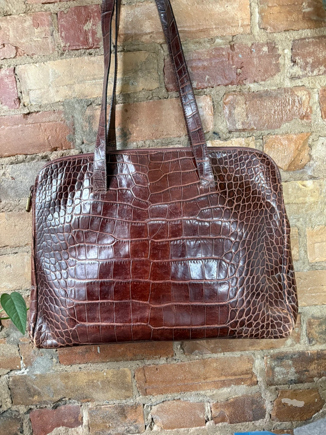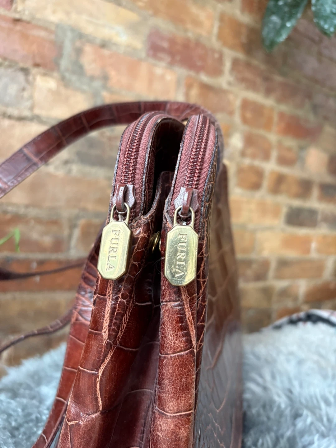 This is a Furla tote bag with a lovely crocodile embossed pattern. The bag is brown leather and has a zipper closure. It's a stylish and functional bag for everyday use!