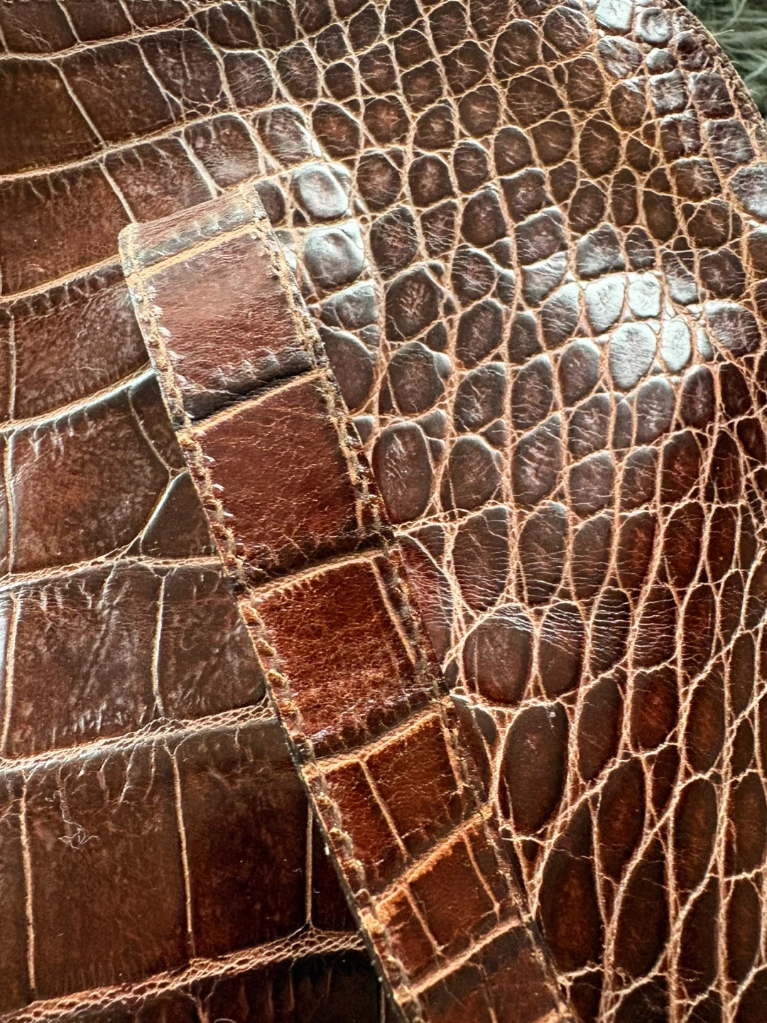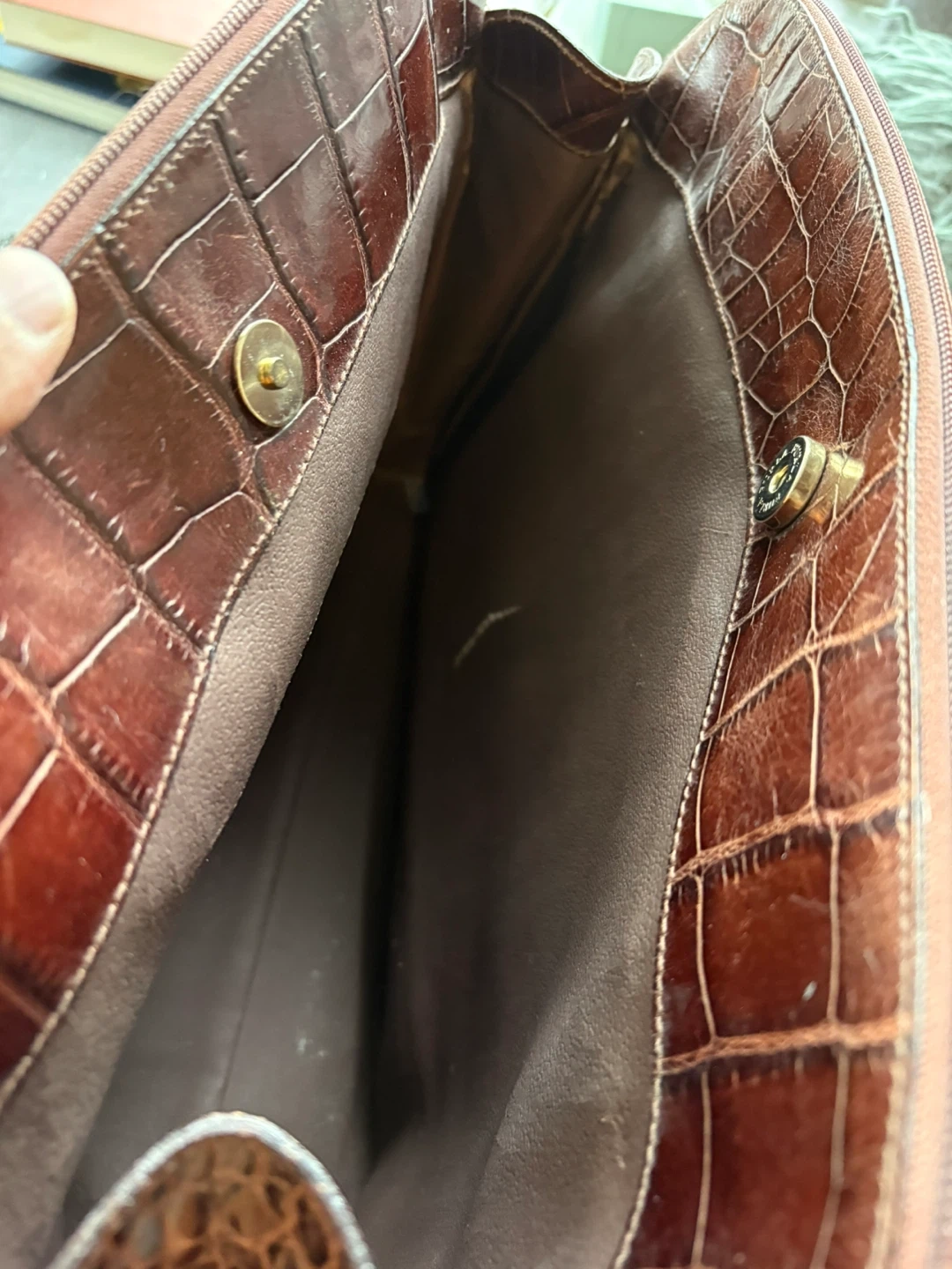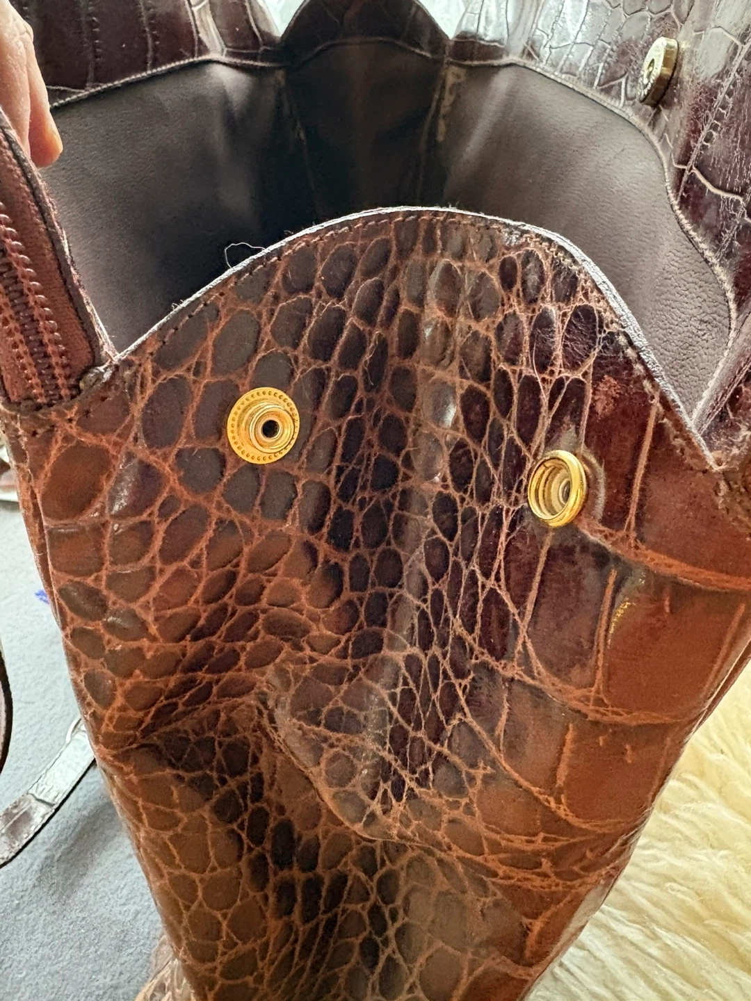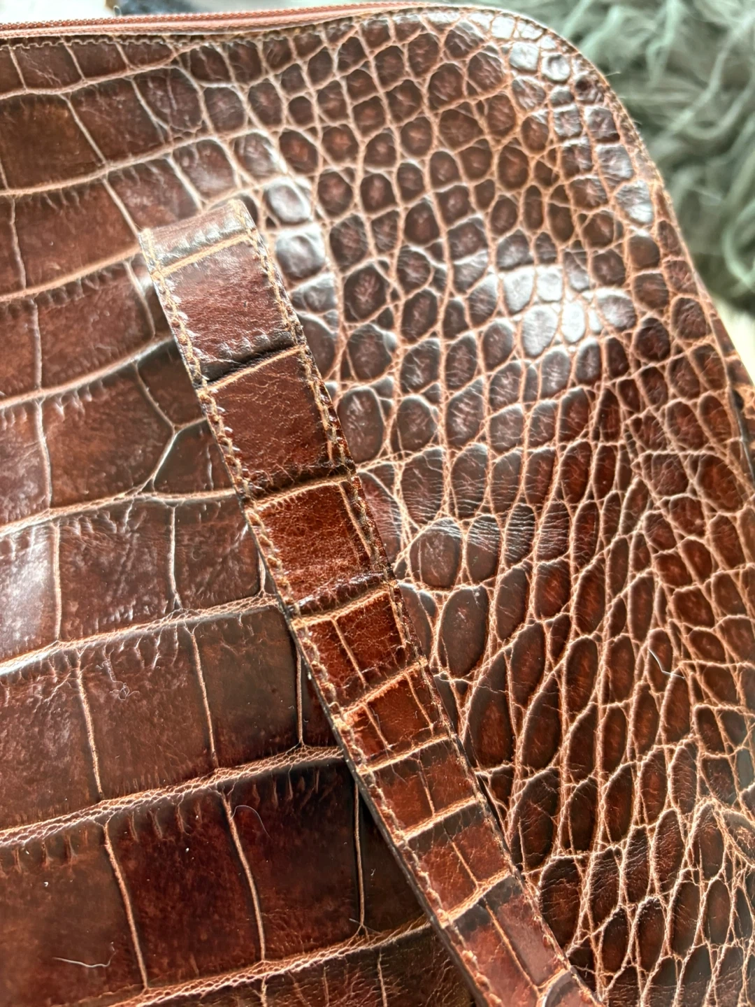This is a Furla tote bag with a lovely crocodile embossed pattern. The bag is brown leather and has a zipper closure. It's a stylish and functional bag for everyday use!