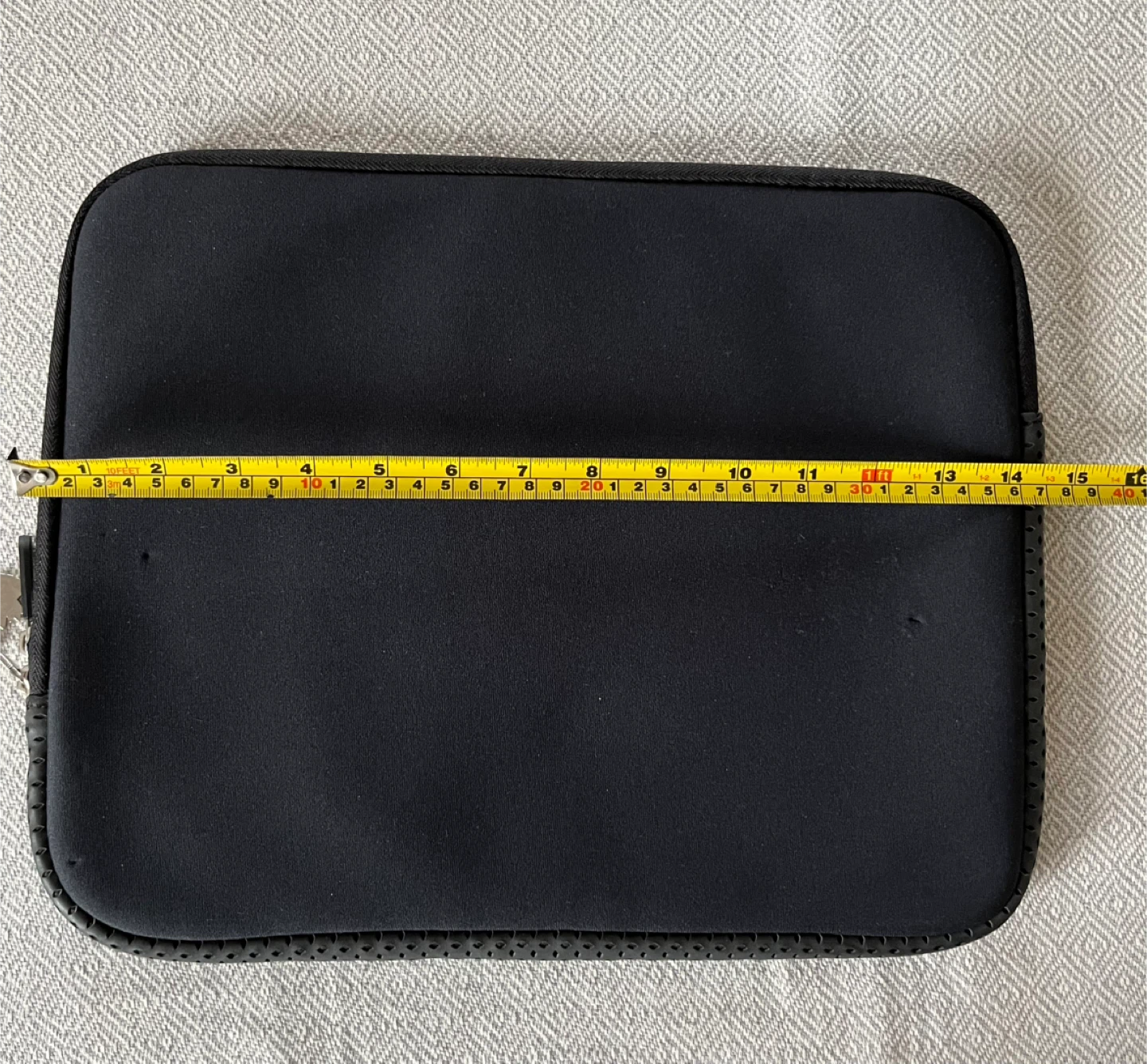 Selling a simple black laptop sleeve! It's in great condition and measures 14 by 11 inches. Perfect for protecting your lap top on the go.