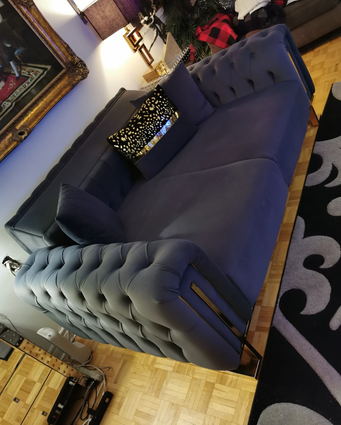 Selling a lovely grey tufted sofa with stylish gold trim. It's in great shape and would look fantastic in any living room! I paid 1370$ , almost brand new , downtown Toronto