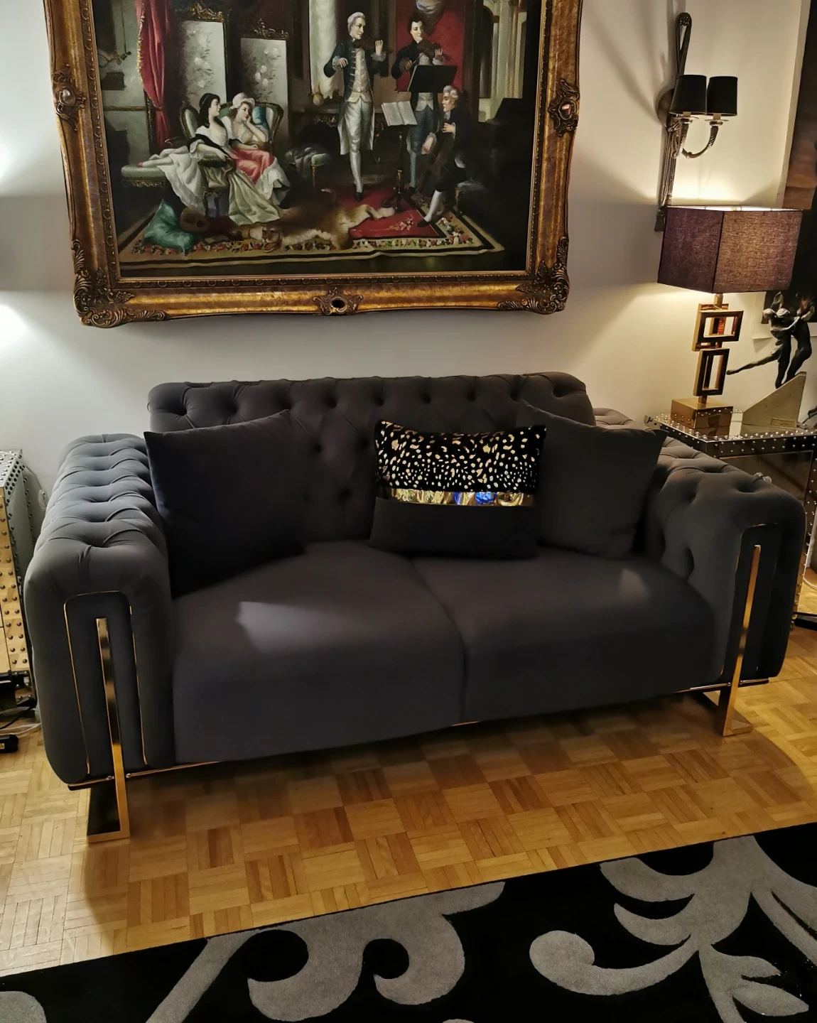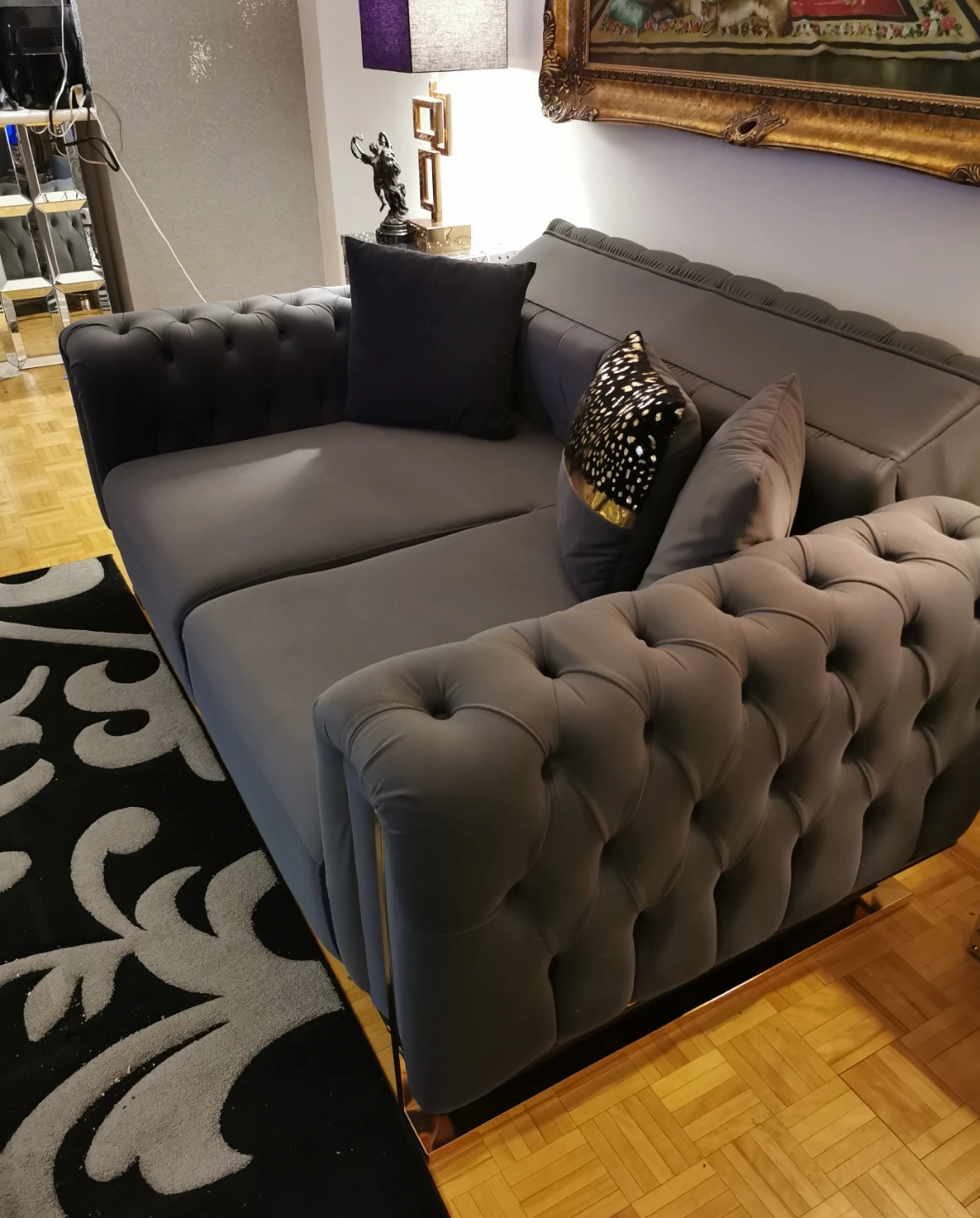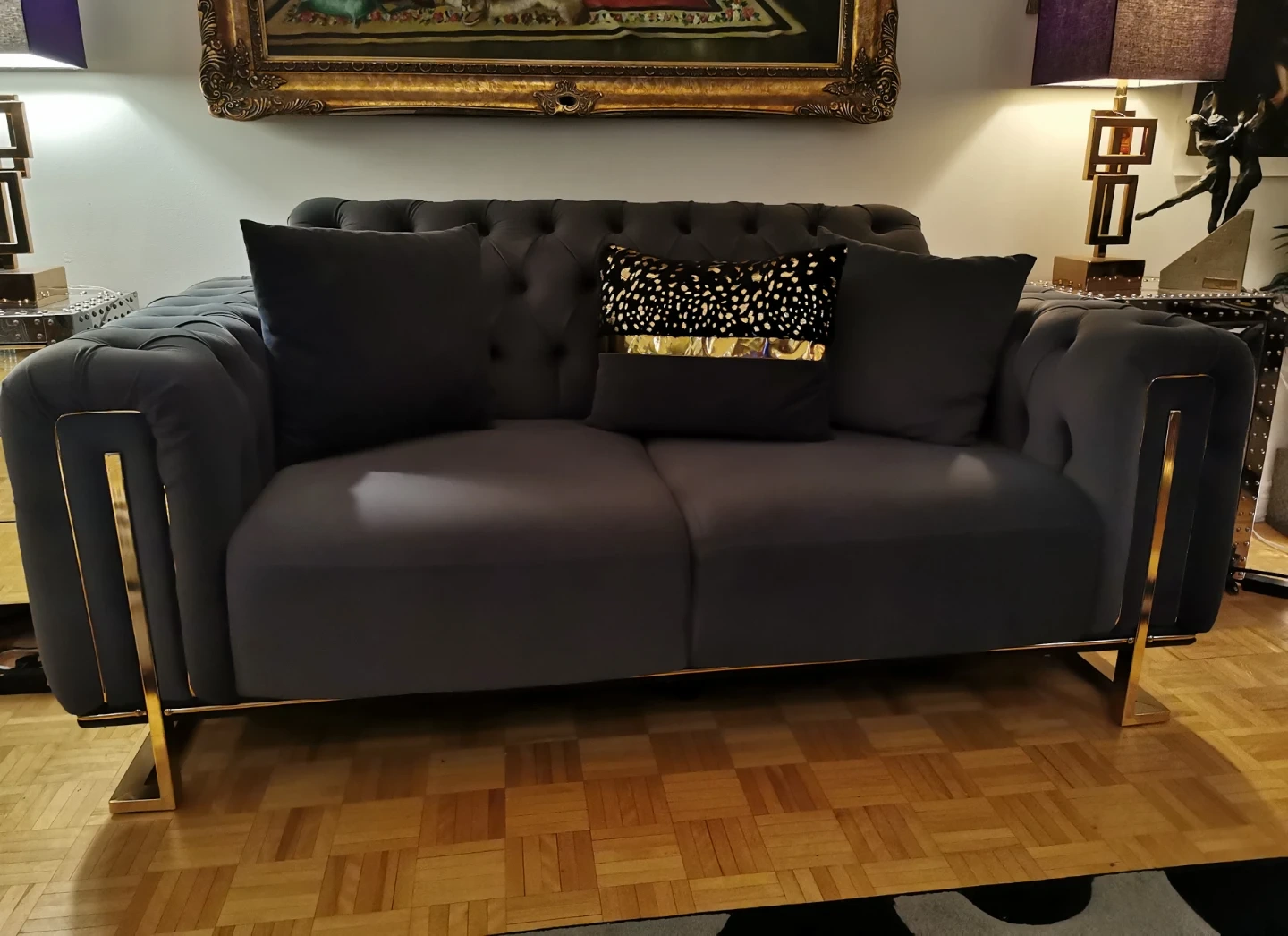 Grey Tufted Sofa with Gold Trim