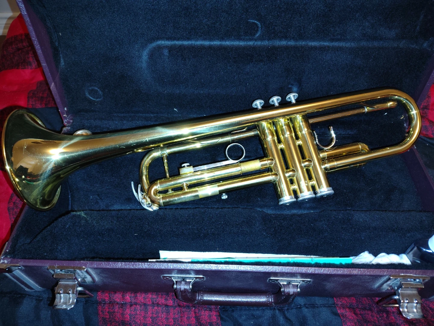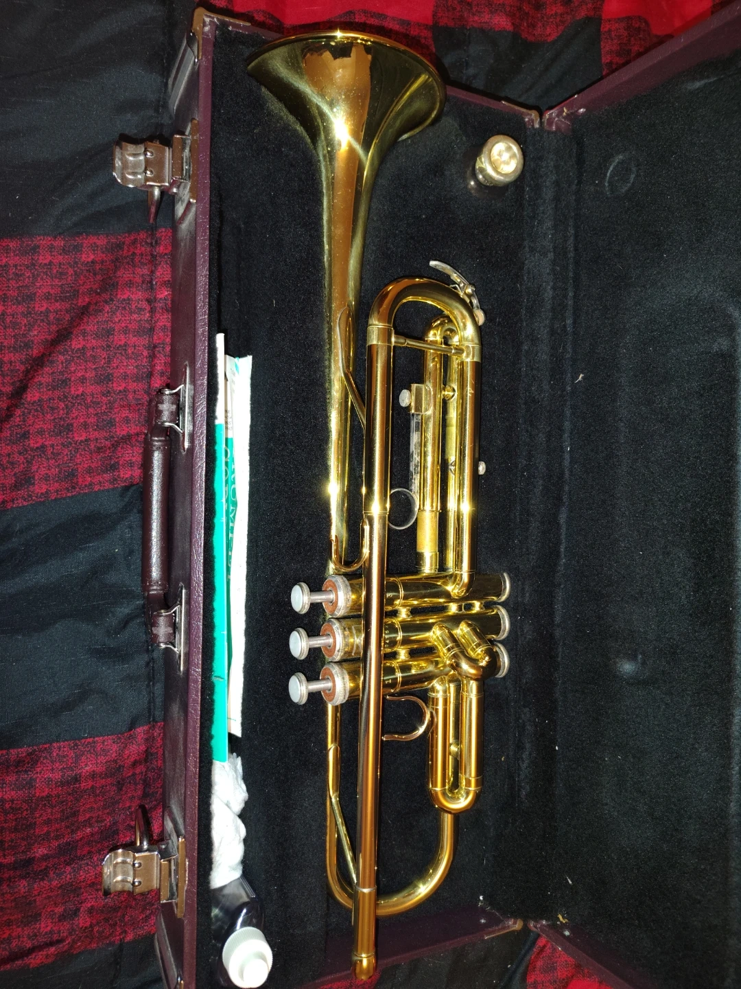 Selling a trumpet that comes with its case. It appears to be in good condition and includes some cleaning accessories. Perfect for someone looking to start playing or upgrade their current instrument!
