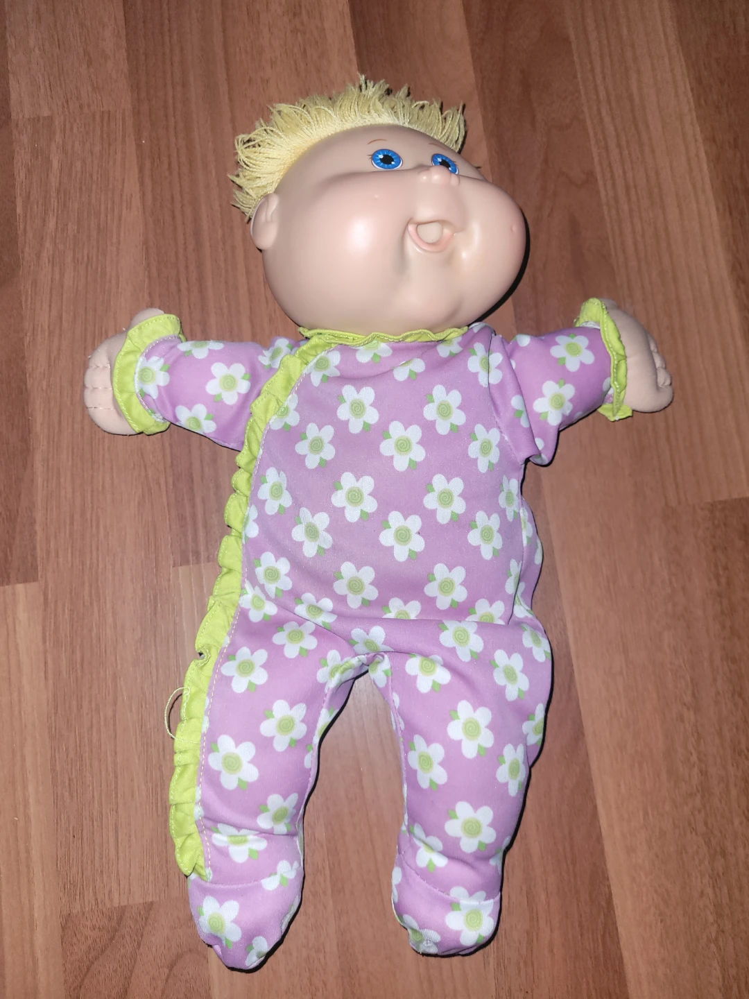 This pre-loved Cabbage Patch Kid doll, with its blonde hair and blue eyes, is ready for a new home. It is in good condition, showing some signs of play but plenty of life left for imaginative adventures. Dressed in a cute floral patterned sleeper, this doll is sure to bring joy and nostalgia.