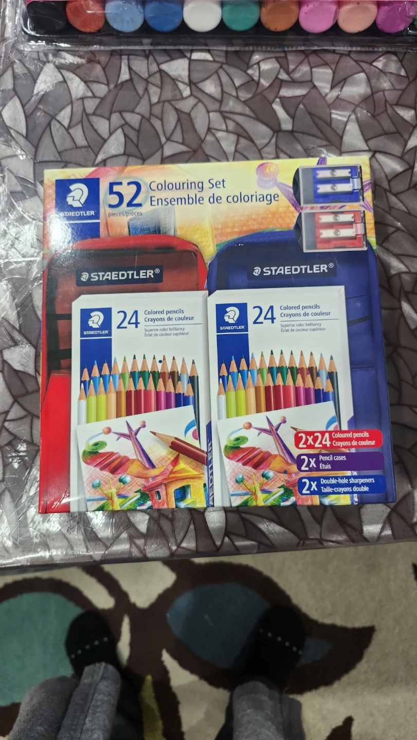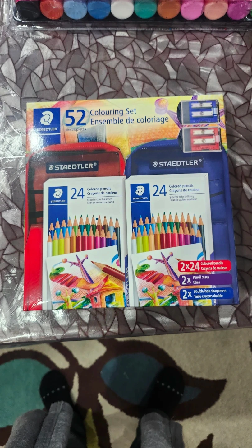 Selling a Seal packed brand new Staedtler 52 piece colouring set! It includes 48 Germany pencils, 2 nylon pencil cases, and 2 double-hole sharpeners. Perfect christmas kids gift. Perfect for 2 kid family too as everything is double in the set.
