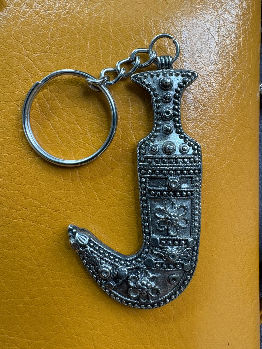 This is a vintage silver-tone keychain featuring a Jambiya dagger design. It has intricate detailing and a unique look. Perfect for adding a touch of vintage charm to your keys!