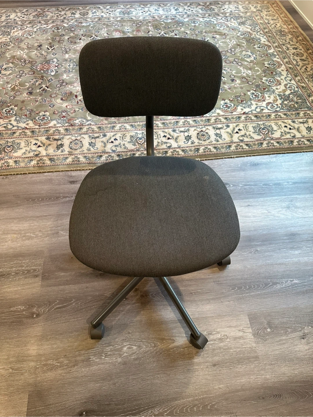 Selling a comfortable office chair. It is in good condition and perfect for a home office or study space. The chair is gray and has a sturdy base with wheels for easy movement.