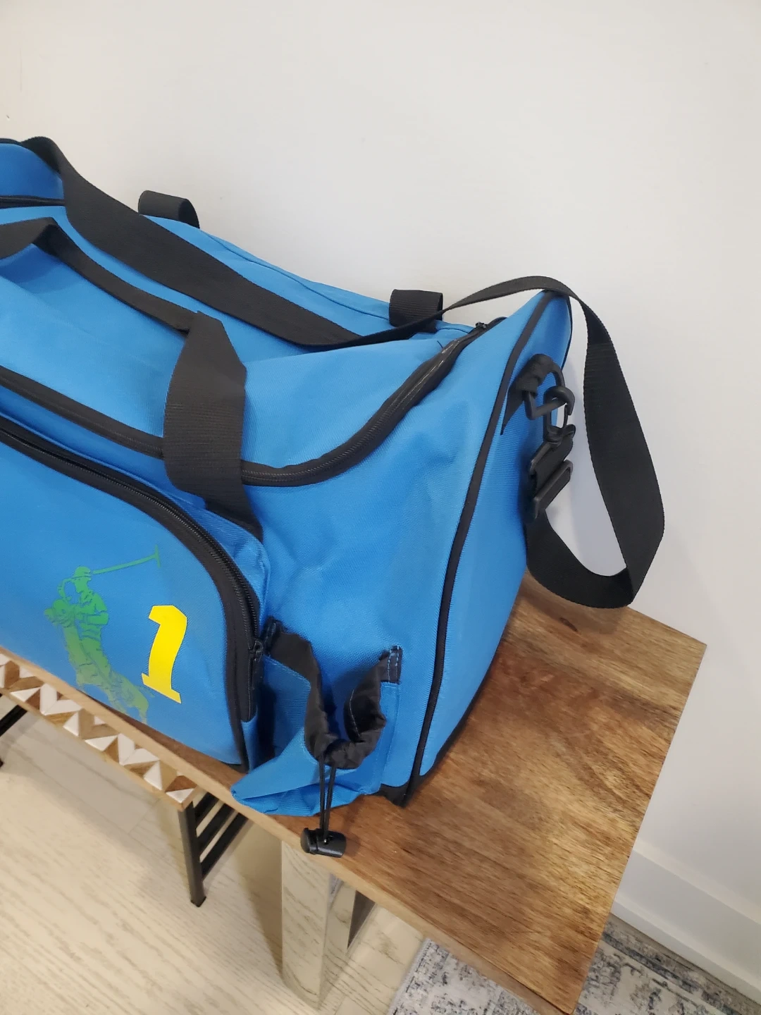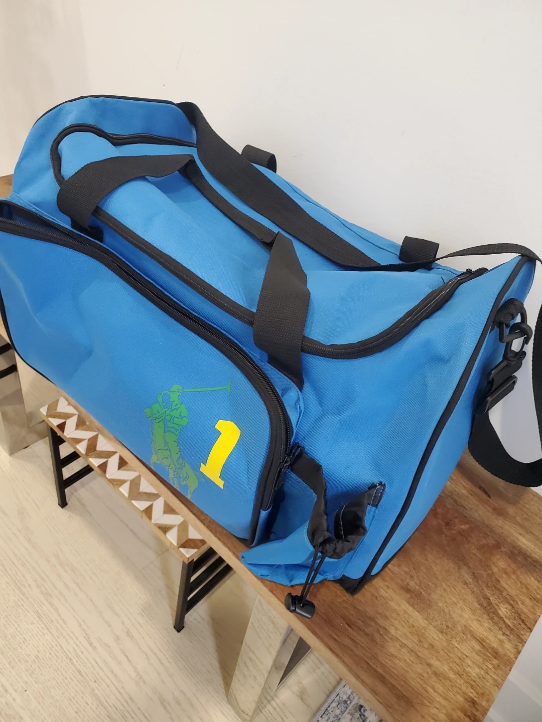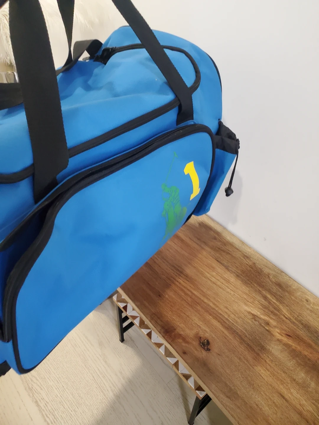 Here's a Polo Ralph Lauren duffle bag in a nice blue colour! It features black straps and a green logo with a yellow number 1. Perfect for the gym or a weekend getaway