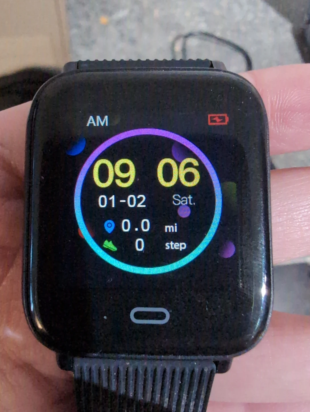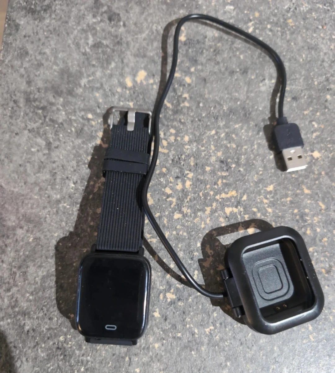Selling a black smartwatch that's in good condition. It comes with its charger so you can keep it powered up and ready to go. Great for tracking steps and activity!