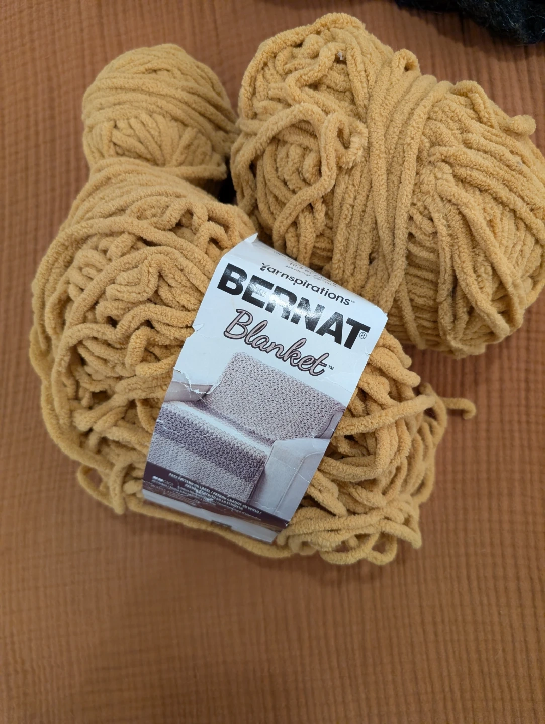 Selling about 2 packages of Bernat Blanket yarn in a lovely gold colour! Used some but of course moved on to a new craft hobby ๐